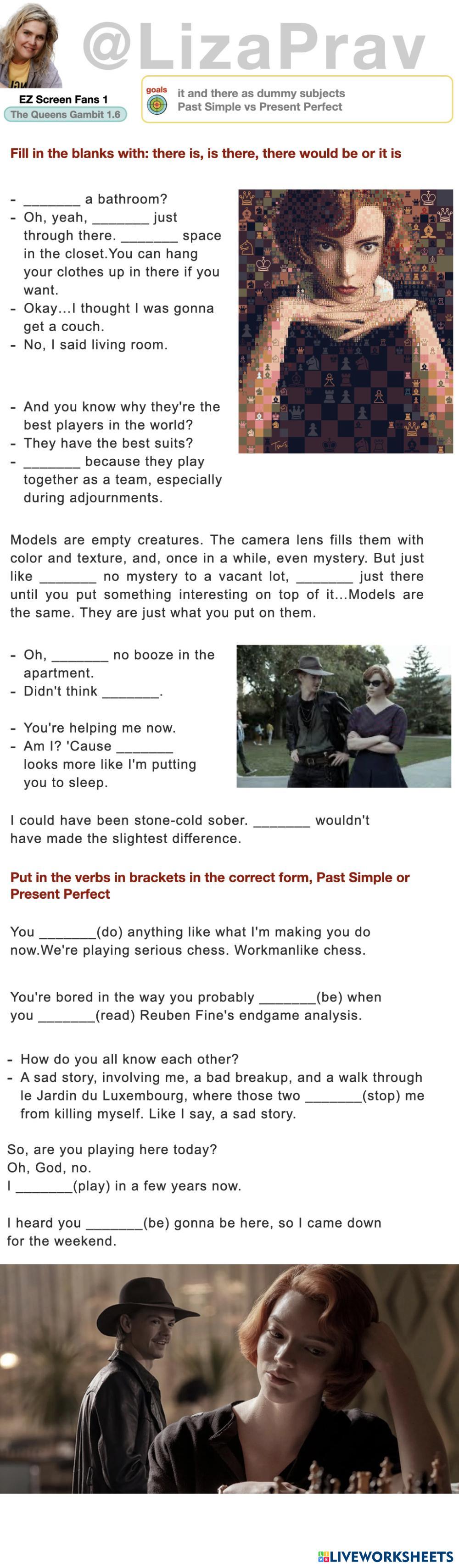 Created by LizaPrav English as a Second Language (ESL) Vocabulary Age 10+ level: A2 English Author's Instructions My Google Classroom Courses × 0 classes selected (0 students total) Quick Access Select all classes (0 classes) All Classes Loading courses... Cancel Share Share to selected Course __COURSE_NAME__ __STUDENT_NAME__ (__STUDENT_EMAIL__) The Queen's Gambit 1.6 Download Worksheet Validation Check my answers Emails my answers to my teacher Full name Group/level School subject Teacher's email or key code Close Submit Validating worksheet... (12) Your answers have been sent to your teacher. Good luck! OK We encountered an error submitting your answers. Please try again. OK Advertisement | Go Ad Free Created by LizaPrav English as a Second Language (ESL) Vocabulary Age 10+ level: A2 English Author's Instructions