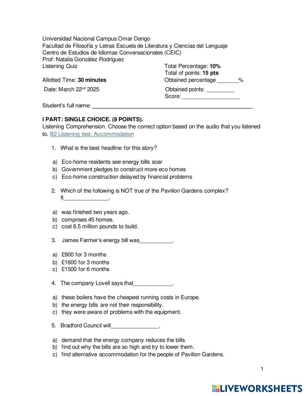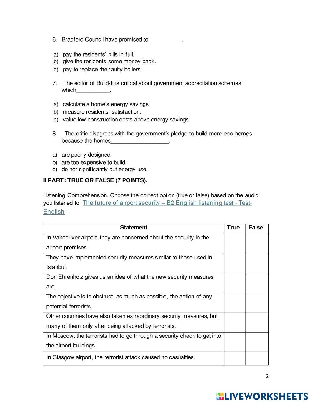 Created by NatiGonRod English as a Second Language (ESL) Listening test Age 15+ level: B2 English Author's Instructions My Google Classroom Courses × 0 classes selected (0 students total) Quick Access Select all classes (0 classes) All Classes Loading courses... Cancel Share Share to selected Course __COURSE_NAME__ __STUDENT_NAME__ (__STUDENT_EMAIL__) Listening Test Download Worksheet Validation Check my answers Emails my answers to my teacher Full name Group/level School subject Teacher's email or key code Close Submit Validating worksheet... (12) Your answers have been sent to your teacher. Good luck! OK We encountered an error submitting your answers. Please try again. OK Advertisement | Go Ad Free Created by NatiGonRod English as a Second Language (ESL) Listening test Age 15+ level: B2 English Author's Instructions