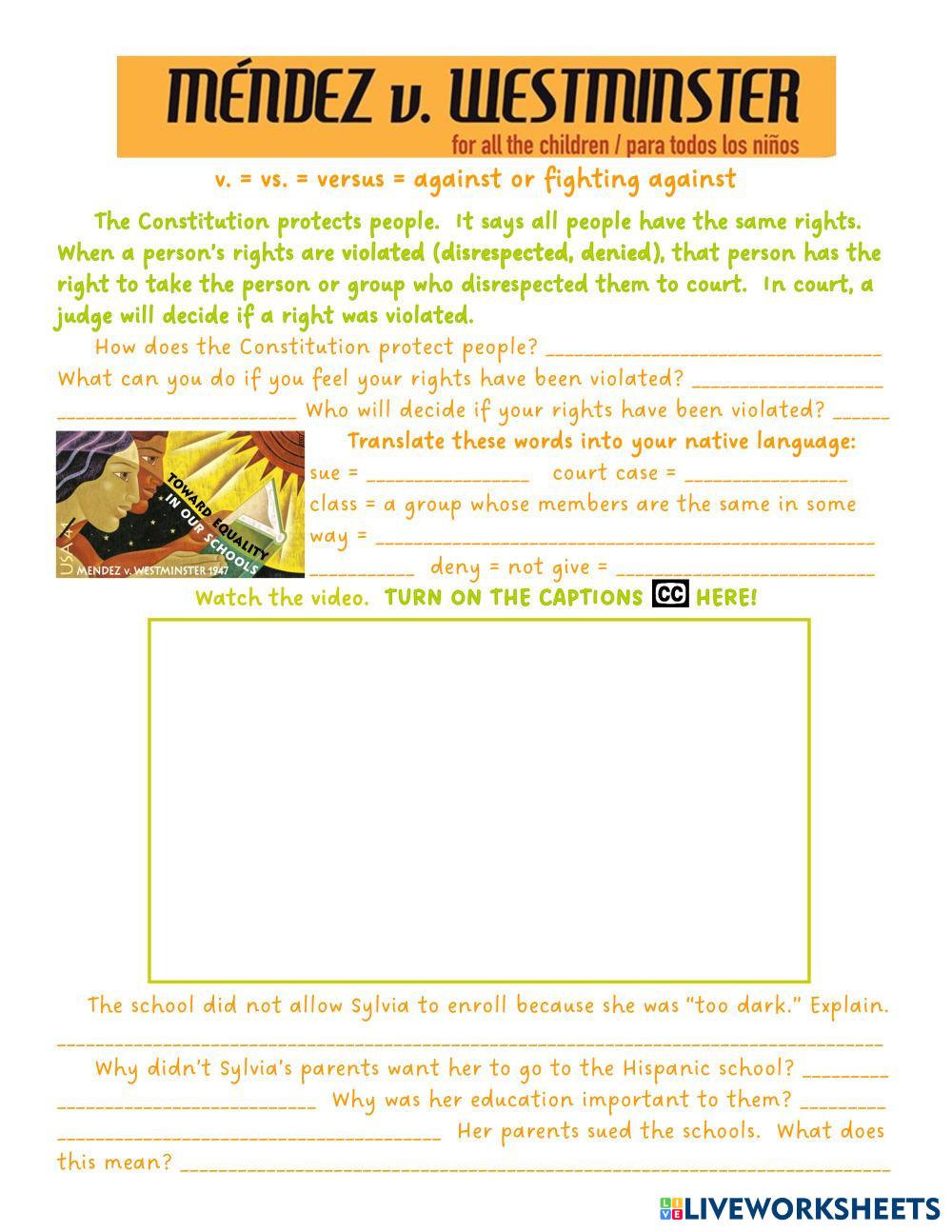 Students watch a video about the Mendez vs. Westminster court case that ended Hispanic segregation in California. Students answer listening comprehension questions about the video content. Students watch a second video depicting the plaintiff in the case reflecting on her experiences. Students write their own reflections about this case and its implications.