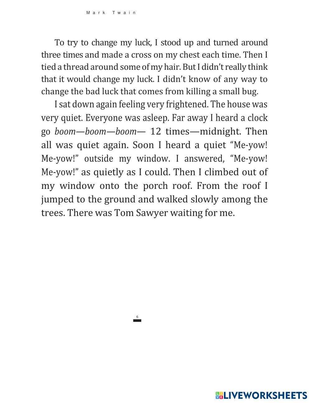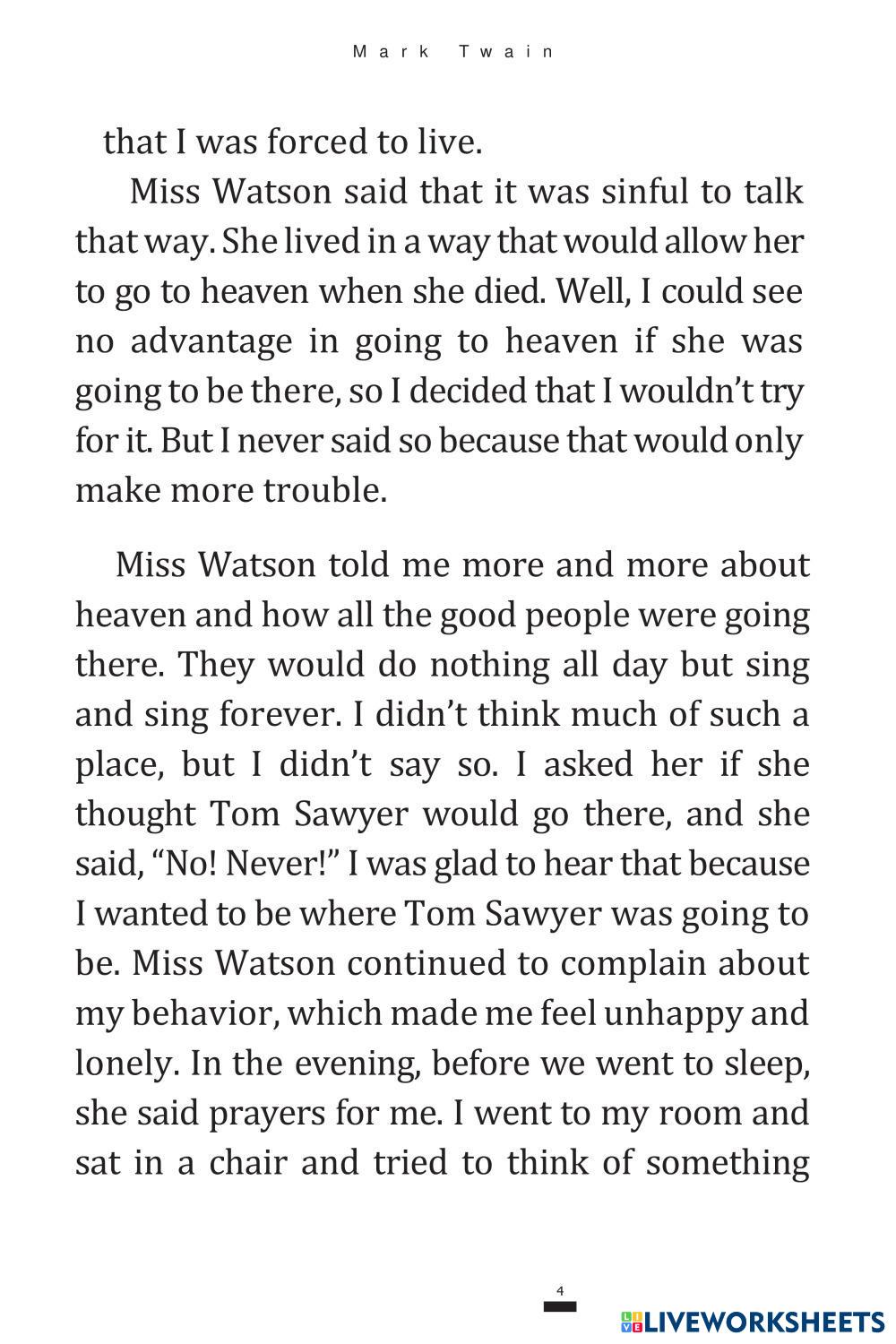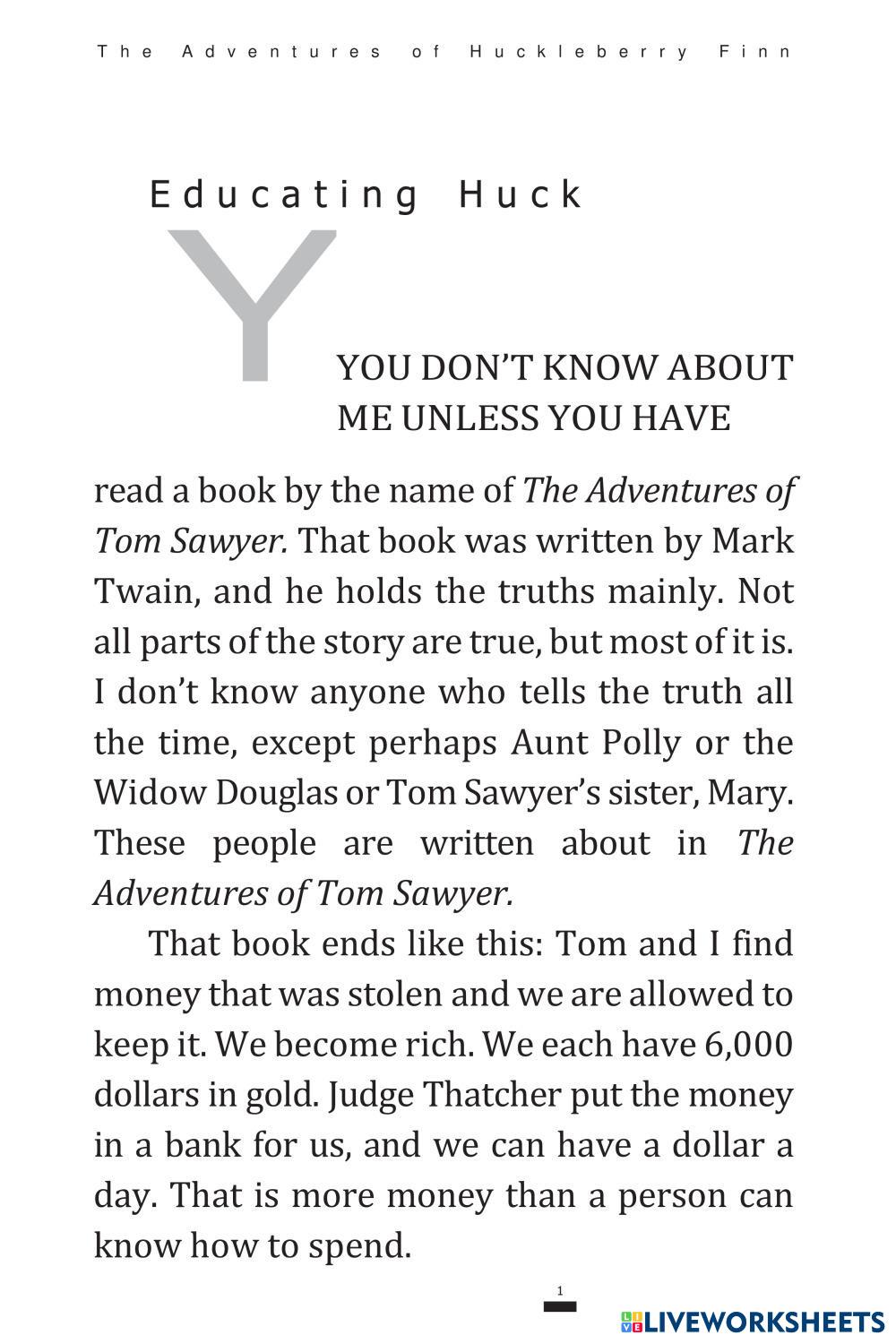 Created by MariaP34 English as a Second Language (ESL) Literature Age 10-15 level: A2 English Author's Instructions My Google Classroom Courses × 0 classes selected (0 students total) Quick Access Select all classes (0 classes) All Classes Loading courses... Cancel Share Share to selected Course __COURSE_NAME__ __STUDENT_NAME__ (__STUDENT_EMAIL__) Adventures of Huckleberry Finn pt.1 Download Worksheet Validation Check my answers Emails my answers to my teacher Full name Group/level School subject Teacher's email or key code Close Submit Validating worksheet... (12) Your answers have been sent to your teacher. Good luck! OK We encountered an error submitting your answers. Please try again. OK Advertisement | Go Ad Free Created by MariaP34 English as a Second Language (ESL) Literature Age 10-15 level: A2 English Author's Instructions