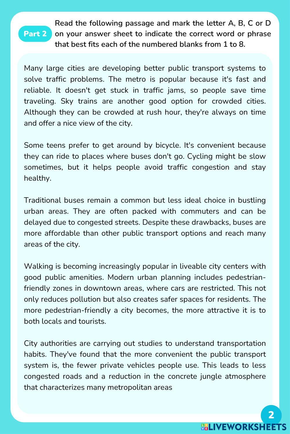 Created by quanh224410 English as a Second Language (ESL) City life Age 15-18 level: grade 9 English Author's Instructions My Google Classroom Courses × 0 classes selected (0 students total) Quick Access Select all classes (0 classes) All Classes Loading courses... Cancel Share Share to selected Course __COURSE_NAME__ __STUDENT_NAME__ (__STUDENT_EMAIL__) 15-MINUTE TEST Download Worksheet Validation Check my answers Emails my answers to my teacher Full name Group/level School subject Teacher's email or key code Close Submit Validating worksheet... (12) Your answers have been sent to your teacher. Good luck! OK We encountered an error submitting your answers. Please try again. OK Advertisement | Go Ad Free Created by quanh224410 English as a Second Language (ESL) City life Age 15-18 level: grade 9 English Author's Instructions