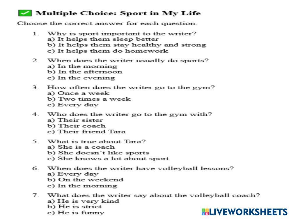 Created byNataliia Pavelchuk English as a Second Language (ESL) Fill in the gaps Age 10-16 level: A2 English Author's Instructions My Google Classroom Courses × 0 classes selected (0 students total) Quick Access Select all classes (0 classes) All Classes Loading courses... Cancel Share Share to selected Course __COURSE_NAME__ __STUDENT_NAME__ (__STUDENT_EMAIL__) Sport In My Life Download Worksheet Validation Check my answers Emails my answers to my teacher Full name Group/level School subject Teacher's email or key code Close Submit Validating worksheet... (12) Your answers have been sent to your teacher. Good luck! OK We encountered an error submitting your answers. Please try again. OK Advertisement | Go Ad Free Created byNataliia Pavelchuk English as a Second Language (ESL) Fill in the gaps Age 10-16 level: A2 English Author's Instructions