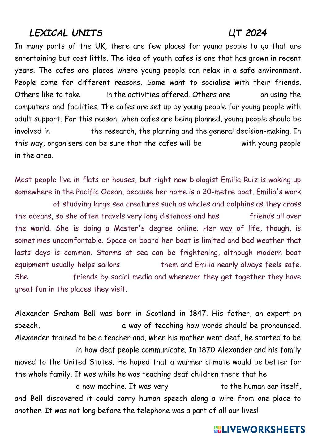 Created by Mika_tima English as a Second Language (ESL) Vocabulary Age 10+ level: 11 English Author's Instructions My Google Classroom Courses × 0 classes selected (0 students total) Quick Access Select all classes (0 classes) All Classes Loading courses... Cancel Share Share to selected Course __COURSE_NAME__ __STUDENT_NAME__ (__STUDENT_EMAIL__) ЦТ 2024 Vocabulary B 8-10 Download Worksheet Validation Check my answers Emails my answers to my teacher Full name Group/level School subject Teacher's email or key code Close Submit Validating worksheet... (12) Your answers have been sent to your teacher. Good luck! OK We encountered an error submitting your answers. Please try again. OK Advertisement | Go Ad Free Created by Mika_tima English as a Second Language (ESL) Vocabulary Age 10+ level: 11 English Author's Instructions
