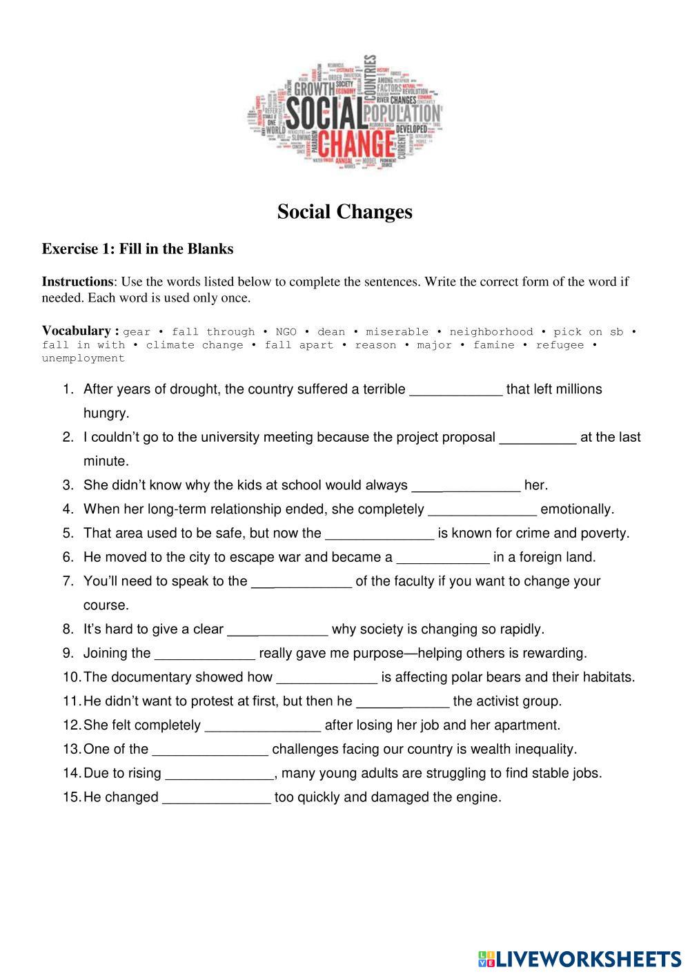 Created by papuch English as a Second Language (ESL) Vocabulary Age 11+ level: B1+ English Author's Instructions Vocabulary practice My Google Classroom Courses × 0 classes selected (0 students total) Quick Access Select all classes (0 classes) All Classes Loading courses... Cancel Share Share to selected Course __COURSE_NAME__ __STUDENT_NAME__ (__STUDENT_EMAIL__) Social changes New Enterprise B1+ unit 8 Download Worksheet Validation Check my answers Emails my answers to my teacher Full name Group/level School subject Teacher's email or key code Close Submit Validating worksheet... (12) Your answers have been sent to your teacher. Good luck! OK We encountered an error submitting your answers. Please try again. OK Advertisement | Go Ad Free Created by papuch English as a Second Language (ESL) Vocabulary Age 11+ level: B1+ English Author's Instructions Vocabulary practice