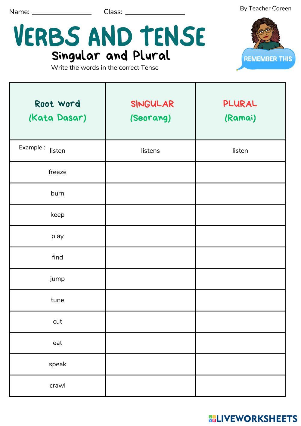 Created by TeacherCoreen English as a Second Language (ESL) Vocabulary and Grammar Age 7-15 level: Primary English Author's Instructions My Google Classroom Courses × 0 classes selected (0 students total) Quick Access Select all classes (0 classes) All Classes Loading courses... Cancel Share Share to selected Course __COURSE_NAME__ __STUDENT_NAME__ (__STUDENT_EMAIL__) English Verbs Singular and Plural form Download Worksheet Validation Check my answers Emails my answers to my teacher Full name Group/level School subject Teacher's email or key code Close Submit Validating worksheet... (12) Your answers have been sent to your teacher. Good luck! OK We encountered an error submitting your answers. Please try again. OK Advertisement | Go Ad Free Created by TeacherCoreen English as a Second Language (ESL) Vocabulary and Grammar Age 7-15 level: Primary English Author's Instructions