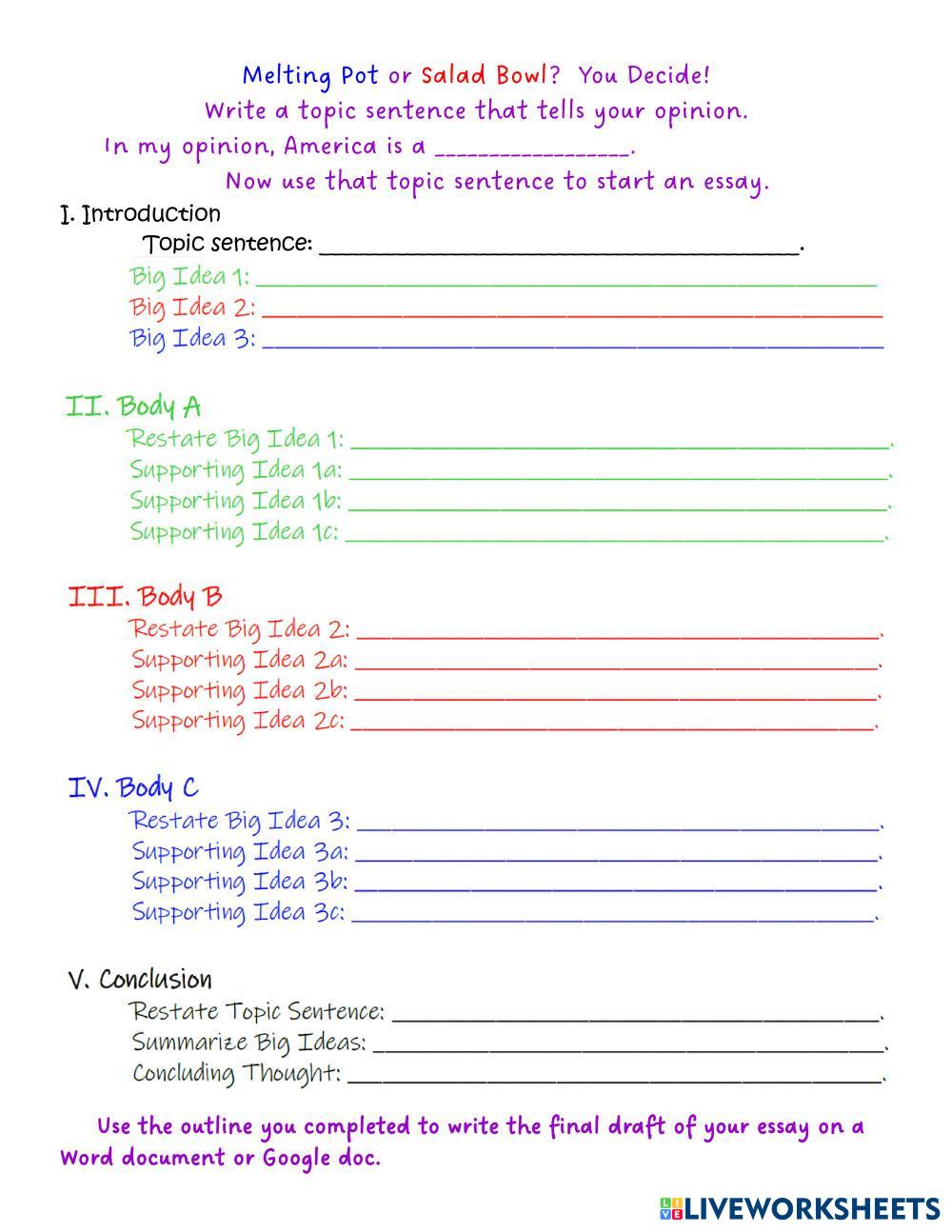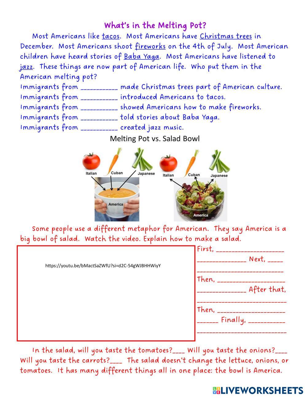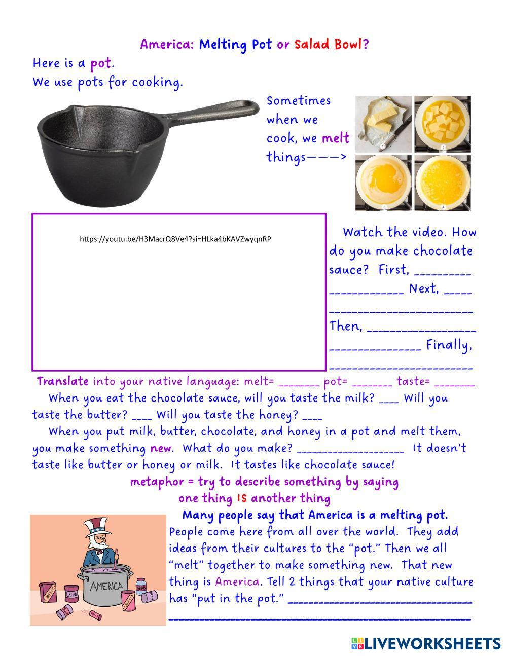 Students compare the melting pot and salad bowl metaphors for America. They write step by step instruction on how to make a melted sauce and how to make a salad. They evaluate the metaphors and write an essay about the one they feel best describes America.