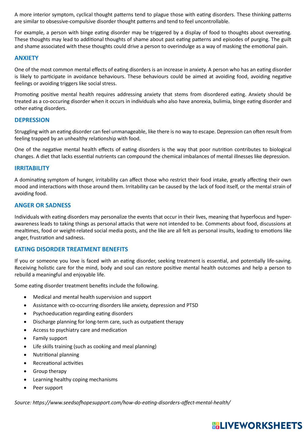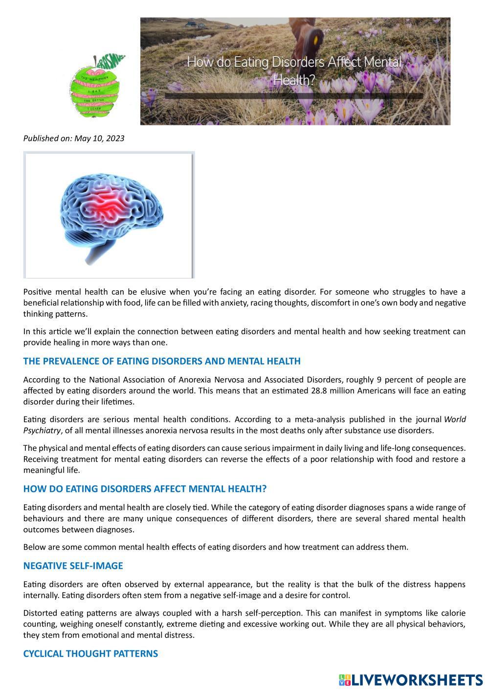 Created byKristīne English as a Second Language (ESL) Reading comprehension Age 13+ level: Intermediate English Author's Instructions My Google Classroom Courses × 0 classes selected (0 students total) Quick Access Select all classes (0 classes) All Classes Loading courses... Cancel Share Share to selected Course __COURSE_NAME__ __STUDENT_NAME__ (__STUDENT_EMAIL__) Article: How Do Eating Disorders Affect Mental Health? Download Worksheet Validation Check my answers Emails my answers to my teacher Full name Group/level School subject Teacher's email or key code Close Submit Validating worksheet... (12) Your answers have been sent to your teacher. Good luck! OK We encountered an error submitting your answers. Please try again. OK Advertisement | Go Ad Free Created byKristīne English as a Second Language (ESL) Reading comprehension Age 13+ level: Intermediate English Author's Instructions