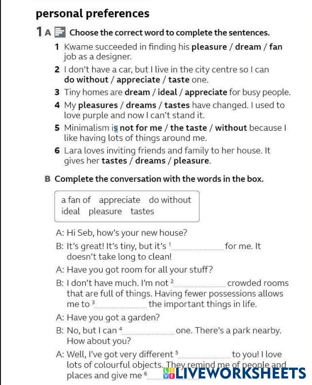 Created byLiliya Ableeva English as a Second Language (ESL) Fill in the gaps Age 18+ level: b1 English Author's Instructions My Google Classroom Courses × 0 classes selected (0 students total) Quick Access Select all classes (0 classes) All Classes Loading courses... Cancel Share Share to selected Course __COURSE_NAME__ __STUDENT_NAME__ (__STUDENT_EMAIL__) Speakout B1+ 1B PERSONAL PREFERENCES Download Worksheet Validation Check my answers Emails my answers to my teacher Full name Group/level School subject Teacher's email or key code Close Submit Validating worksheet... (12) Your answers have been sent to your teacher. Good luck! OK We encountered an error submitting your answers. Please try again. OK Advertisement | Go Ad Free Created byLiliya Ableeva English as a Second Language (ESL) Fill in the gaps Age 18+ level: b1 English Author's Instructions