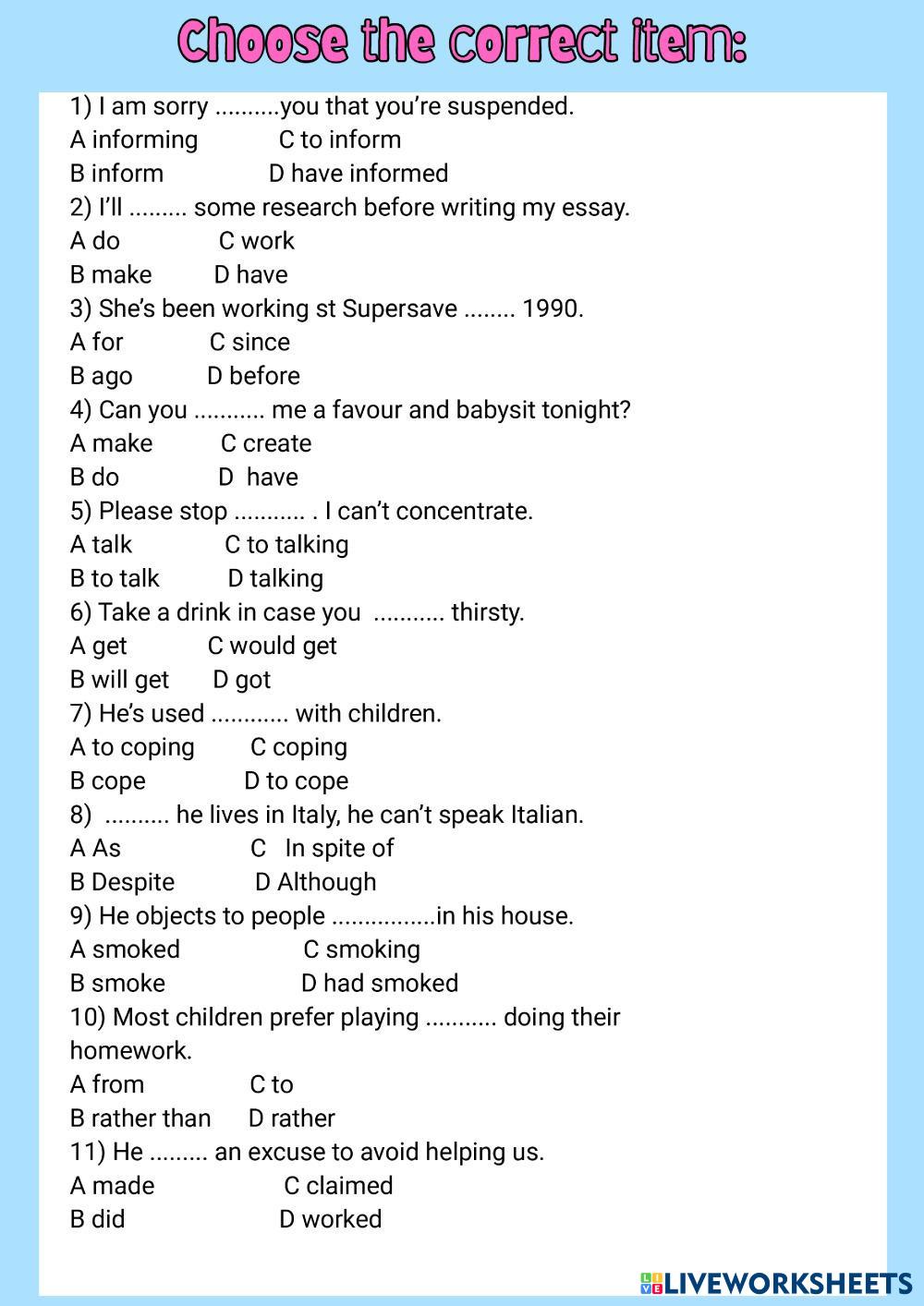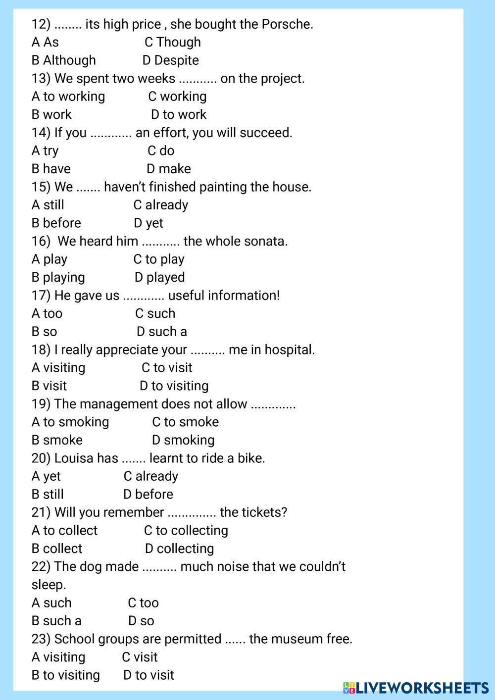 Created byYuliia Kharchenko English as a Second Language (ESL) Grammar Age 15+ level: B1+ English Author's Instructions My Google Classroom Courses × 0 classes selected (0 students total) Quick Access Select all classes (0 classes) All Classes Loading courses... Cancel Share Share to selected Course __COURSE_NAME__ __STUDENT_NAME__ (__STUDENT_EMAIL__) Choose the correct item Download Worksheet Validation Check my answers Emails my answers to my teacher Full name Group/level School subject Teacher's email or key code Close Submit Validating worksheet... (12) Your answers have been sent to your teacher. Good luck! OK We encountered an error submitting your answers. Please try again. OK Advertisement | Go Ad Free Created byYuliia Kharchenko English as a Second Language (ESL) Grammar Age 15+ level: B1+ English Author's Instructions