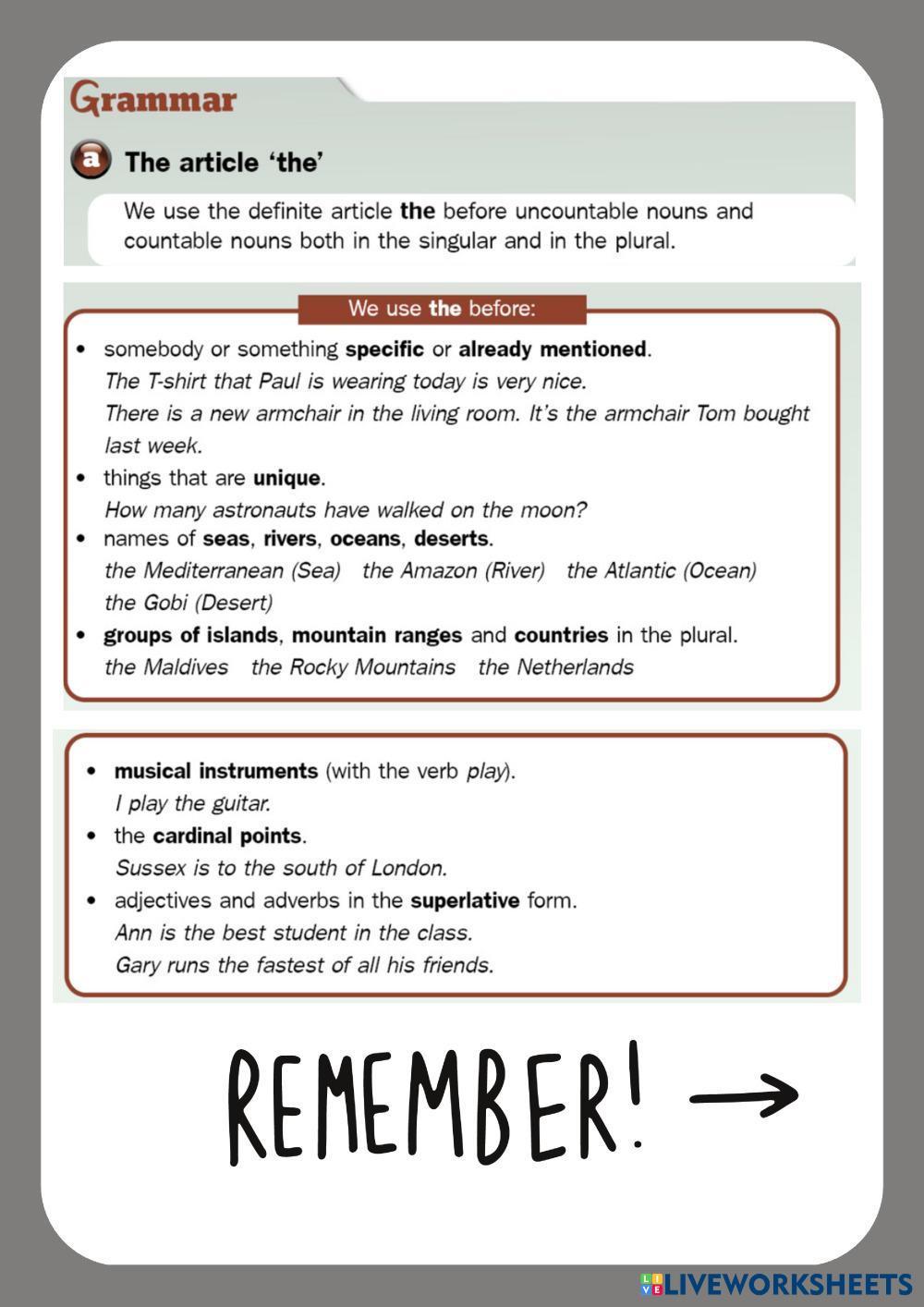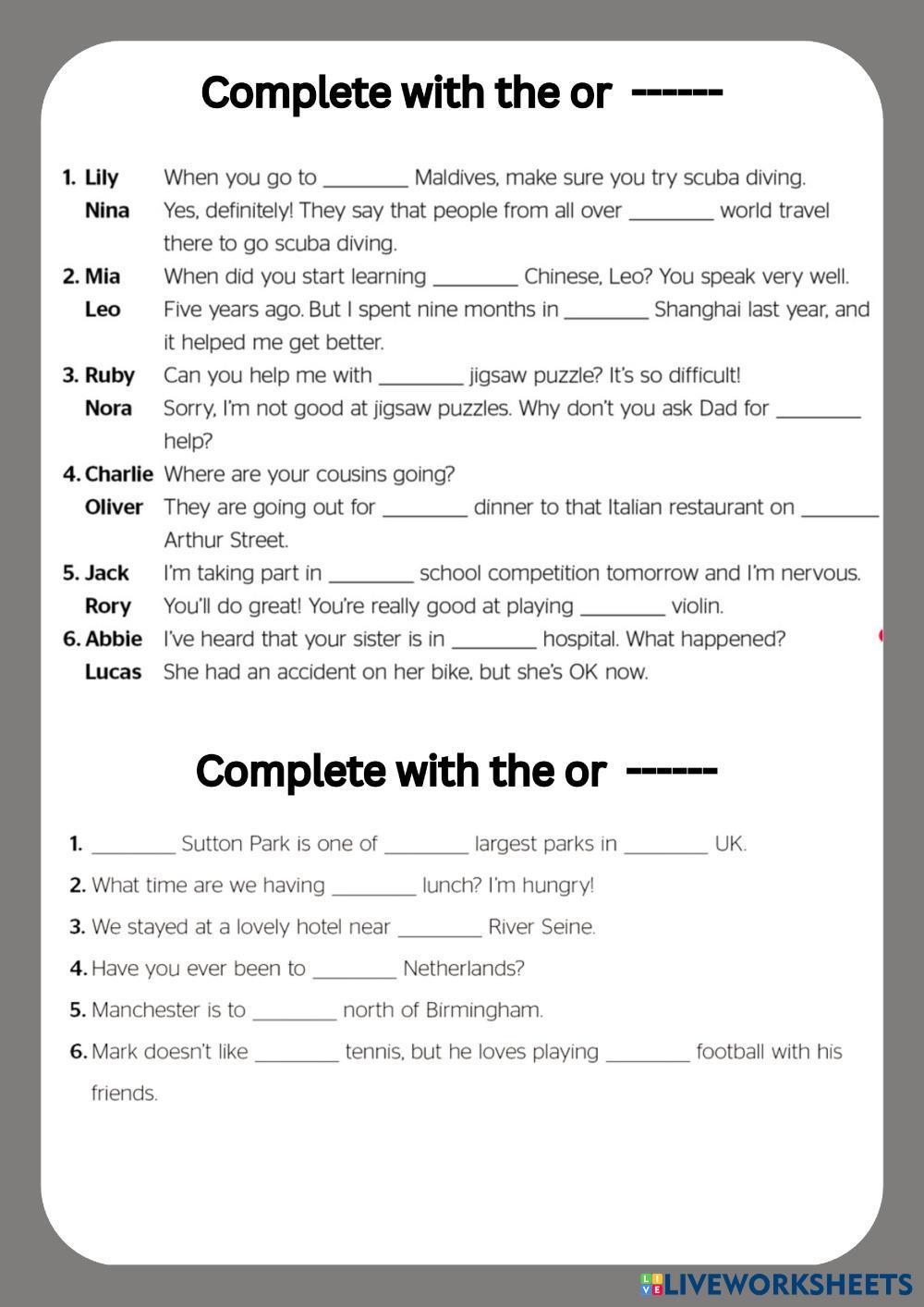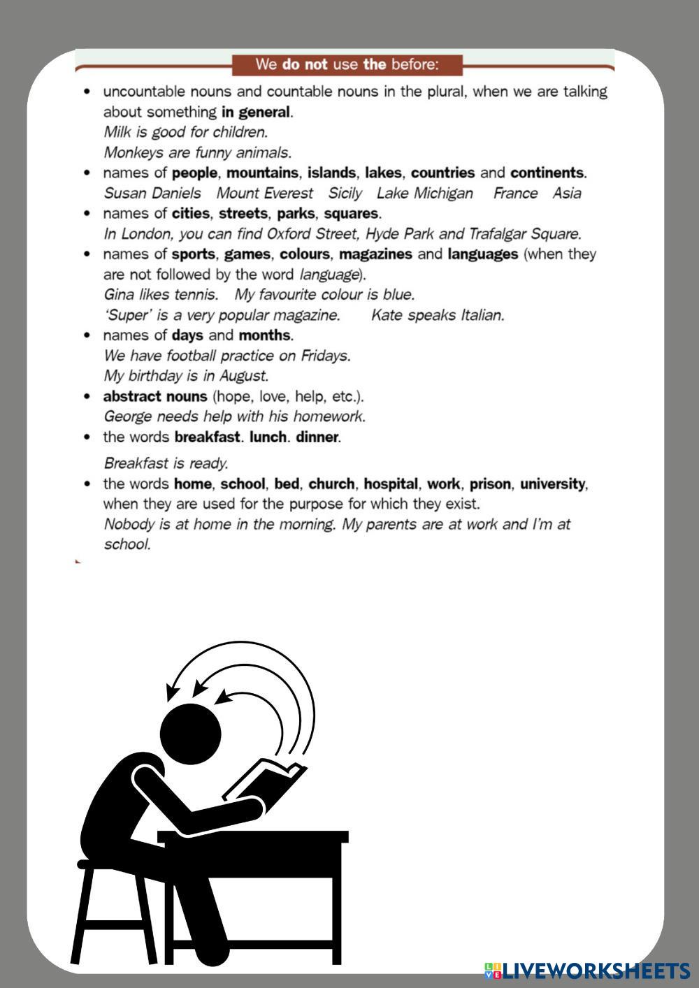 Created byYuliia Kharchenko English as a Second Language (ESL) Grammar Age 13-18 level: A2+ English Author's Instructions My Google Classroom Courses × 0 classes selected (0 students total) Quick Access Select all classes (0 classes) All Classes Loading courses... Cancel Share Share to selected Course __COURSE_NAME__ __STUDENT_NAME__ (__STUDENT_EMAIL__) The or without the Download Worksheet Validation Check my answers Emails my answers to my teacher Full name Group/level School subject Teacher's email or key code Close Submit Validating worksheet... (12) Your answers have been sent to your teacher. Good luck! OK We encountered an error submitting your answers. Please try again. OK Advertisement | Go Ad Free Created byYuliia Kharchenko English as a Second Language (ESL) Grammar Age 13-18 level: A2+ English Author's Instructions