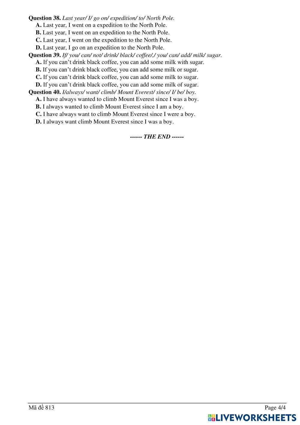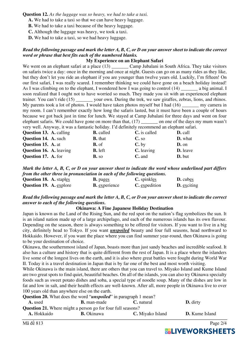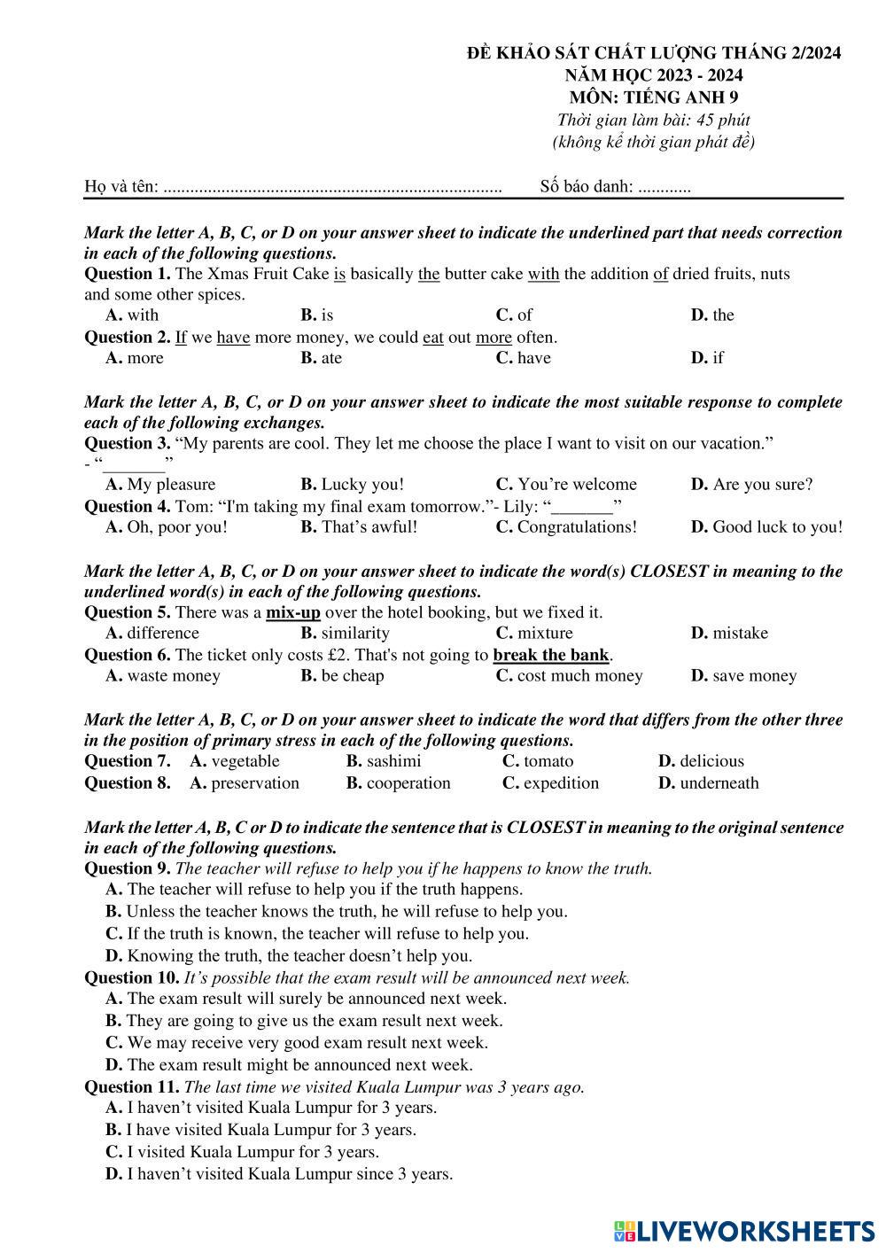 Created by MsThuSnobel English for Second Language Grammar, Vocabulary and Phonetics Age 14-18 level: 9 English Author's Instructions Test for my Students My Google Classroom Courses × 0 classes selected (0 students total) Quick Access Select all classes (0 classes) All Classes Loading courses... Cancel Share Share to selected Course __COURSE_NAME__ __STUDENT_NAME__ (__STUDENT_EMAIL__) Khảo sát chất lượng 9 vào 10_No.3 Download Worksheet Validation Check my answers Emails my answers to my teacher Full name Group/level School subject Teacher's email or key code Close Submit Validating worksheet... (12) Your answers have been sent to your teacher. Good luck! OK We encountered an error submitting your answers. Please try again. OK Advertisement | Go Ad Free Created by MsThuSnobel English for Second Language Grammar, Vocabulary and Phonetics Age 14-18 level: 9 English Author's Instructions Test for my Students