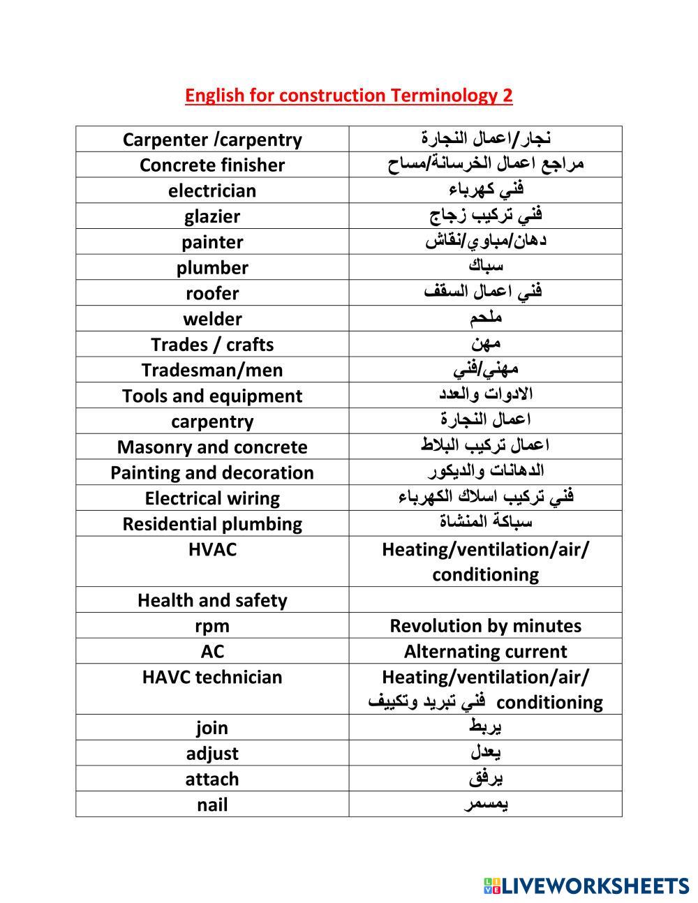 Created by Nader2022 English for Specific Purposes (ESP) Esp Age 16-15 level: 2A English Author's Instructions My Google Classroom Courses × 0 classes selected (0 students total) Quick Access Select all classes (0 classes) All Classes Loading courses... Cancel Share Share to selected Course __COURSE_NAME__ __STUDENT_NAME__ (__STUDENT_EMAIL__) Terminology ESP English for construction Download Worksheet Validation Check my answers Emails my answers to my teacher Full name Group/level School subject Teacher's email or key code Close Submit Validating worksheet... (12) Your answers have been sent to your teacher. Good luck! OK We encountered an error submitting your answers. Please try again. OK Advertisement | Go Ad Free Created by Nader2022 English for Specific Purposes (ESP) Esp Age 16-15 level: 2A English Author's Instructions