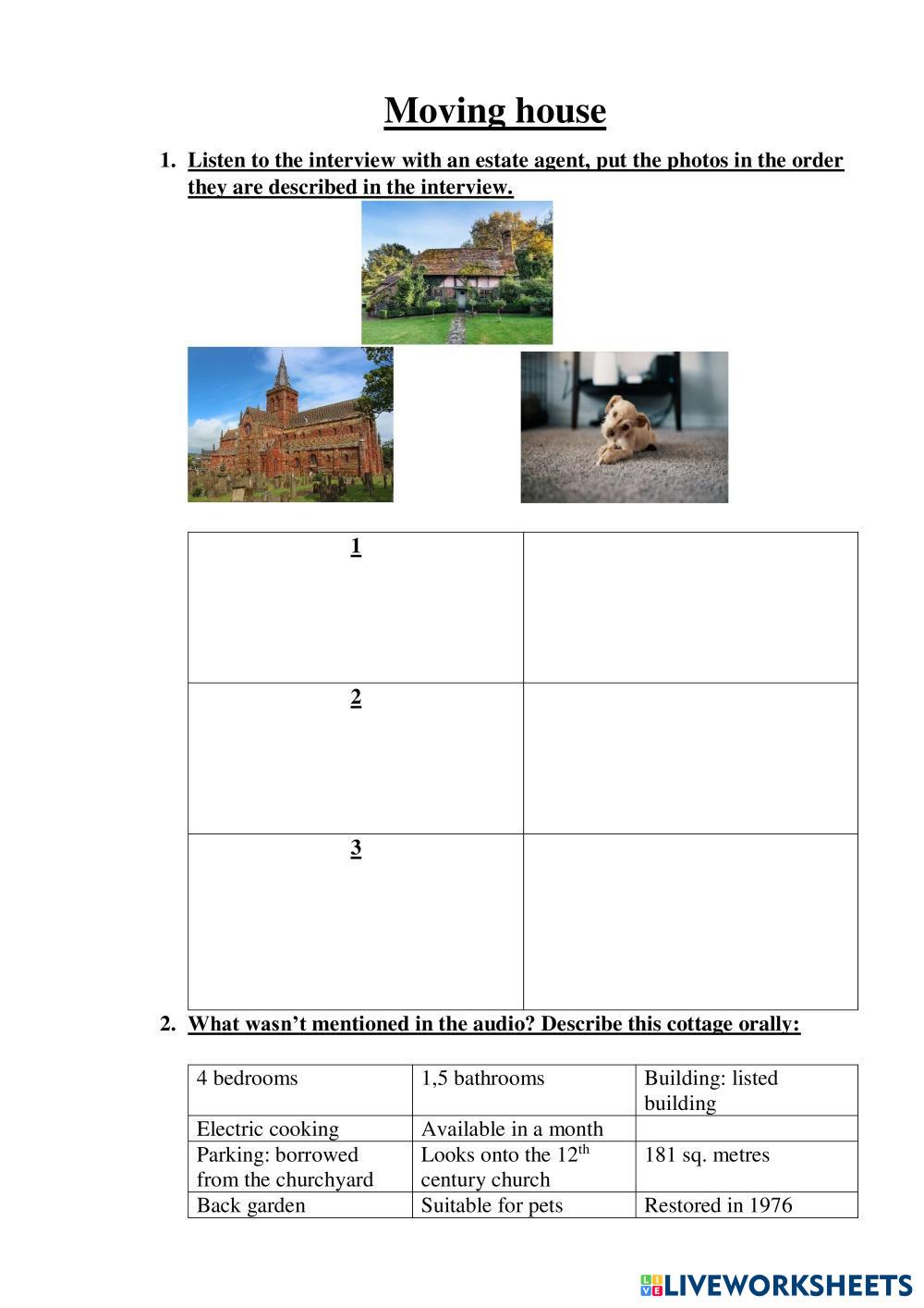 Created by PavAlex English English Age 14 level: 10 English Author's Instructions Do the task My Google Classroom Courses × 0 classes selected (0 students total) Quick Access Select all classes (0 classes) All Classes Loading courses... Cancel Share Share to selected Course __COURSE_NAME__ __STUDENT_NAME__ (__STUDENT_EMAIL__) Moving house Download Worksheet Validation Check my answers Emails my answers to my teacher Full name Group/level School subject Teacher's email or key code Close Submit Validating worksheet... (12) Your answers have been sent to your teacher. Good luck! OK We encountered an error submitting your answers. Please try again. OK Advertisement | Go Ad Free Created by PavAlex English English Age 14 level: 10 English Author's Instructions Do the task