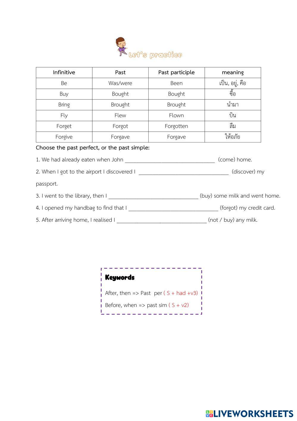 Created by junoirlovebabby English Tense Age 15-12 level: M.3 English Author's Instructions My Google Classroom Courses × 0 classes selected (0 students total) Quick Access Select all classes (0 classes) All Classes Loading courses... Cancel Share Share to selected Course __COURSE_NAME__ __STUDENT_NAME__ (__STUDENT_EMAIL__) Past Perfect tense worksheet Download Worksheet Validation Check my answers Emails my answers to my teacher Full name Group/level School subject Teacher's email or key code Close Submit Validating worksheet... (12) Your answers have been sent to your teacher. Good luck! OK We encountered an error submitting your answers. Please try again. OK Advertisement | Go Ad Free Created by junoirlovebabby English Tense Age 15-12 level: M.3 English Author's Instructions