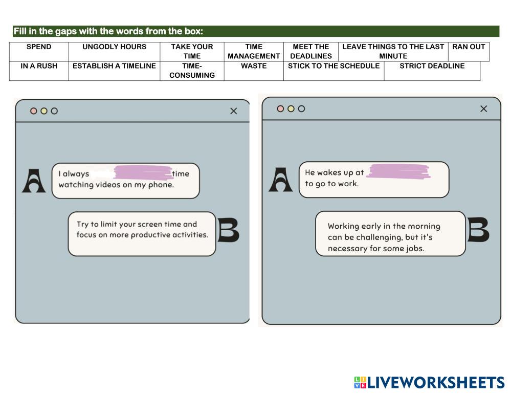 Created by tataros English Collocations, verbs Age 15+ level: B1-B2 English Author's Instructions My Google Classroom Courses × 0 classes selected (0 students total) Quick Access Select all classes (0 classes) All Classes Loading courses... Cancel Share Share to selected Course __COURSE_NAME__ __STUDENT_NAME__ (__STUDENT_EMAIL__) Time collocations Download Worksheet Validation Check my answers Emails my answers to my teacher Full name Group/level School subject Teacher's email or key code Close Submit Validating worksheet... (12) Your answers have been sent to your teacher. Good luck! OK We encountered an error submitting your answers. Please try again. OK Advertisement | Go Ad Free Created by tataros English Collocations, verbs Age 15+ level: B1-B2 English Author's Instructions