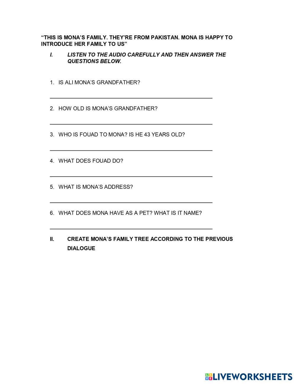 Created byJonathan Sangama Torres ENGLISH LISTENING AND GRAMMAR Age 8+ level: Basic English Author's Instructions My Google Classroom Courses × 0 classes selected (0 students total) Quick Access Select all classes (0 classes) All Classes Loading courses... Cancel Share Share to selected Course __COURSE_NAME__ __STUDENT_NAME__ (__STUDENT_EMAIL__) MONA'S FAMILY Download Worksheet Validation Check my answers Emails my answers to my teacher Full name Group/level School subject Teacher's email or key code Close Submit Validating worksheet... (12) Your answers have been sent to your teacher. Good luck! OK We encountered an error submitting your answers. Please try again. OK Advertisement | Go Ad Free Created byJonathan Sangama Torres ENGLISH LISTENING AND GRAMMAR Age 8+ level: Basic English Author's Instructions