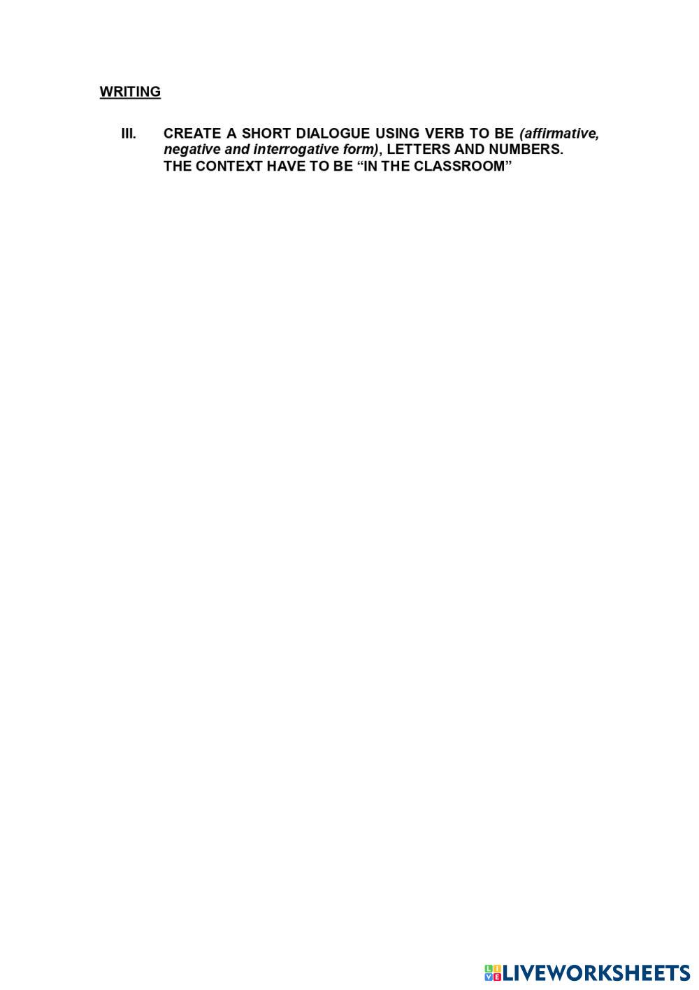 Created byJonathan Sangama Torres ENGLISH PRACTICE Age 8+ level: BASIC English Author's Instructions My Google Classroom Courses × 0 classes selected (0 students total) Quick Access Select all classes (0 classes) All Classes Loading courses... Cancel Share Share to selected Course __COURSE_NAME__ __STUDENT_NAME__ (__STUDENT_EMAIL__) PRACTICE Download Worksheet Validation Check my answers Emails my answers to my teacher Full name Group/level School subject Teacher's email or key code Close Submit Validating worksheet... (12) Your answers have been sent to your teacher. Good luck! OK We encountered an error submitting your answers. Please try again. OK Advertisement | Go Ad Free Created byJonathan Sangama Torres ENGLISH PRACTICE Age 8+ level: BASIC English Author's Instructions