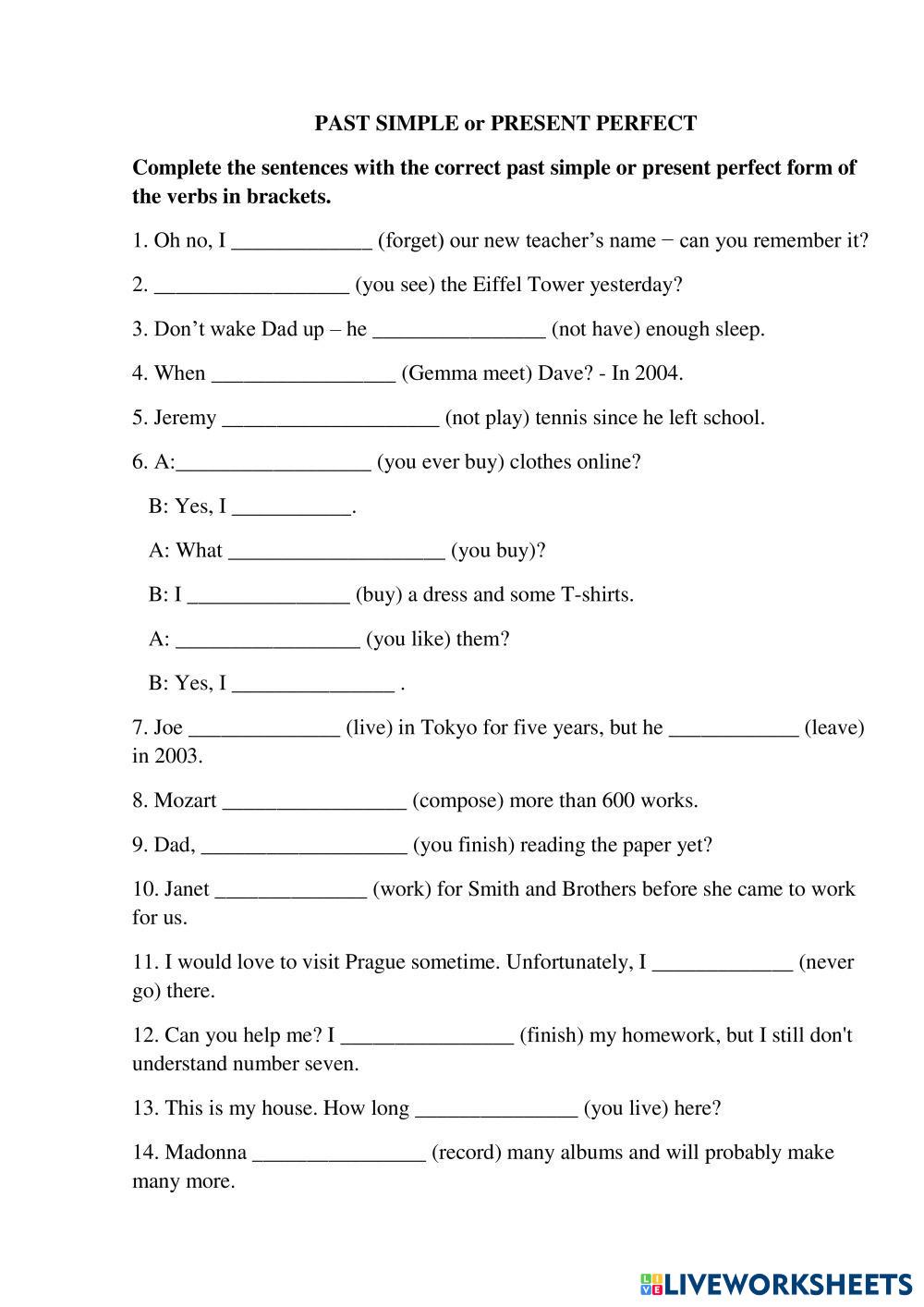 Created by feruka English Grammar Age 12+ level: pre-intermediate English Author's Instructions My Google Classroom Courses × 0 classes selected (0 students total) Quick Access Select all classes (0 classes) All Classes Loading courses... Cancel Share Share to selected Course __COURSE_NAME__ __STUDENT_NAME__ (__STUDENT_EMAIL__) Past Simple or Present Perfect Download Worksheet Validation Check my answers Emails my answers to my teacher Full name Group/level School subject Teacher's email or key code Close Submit Validating worksheet... (12) Your answers have been sent to your teacher. Good luck! OK We encountered an error submitting your answers. Please try again. OK Advertisement | Go Ad Free Created by feruka English Grammar Age 12+ level: pre-intermediate English Author's Instructions