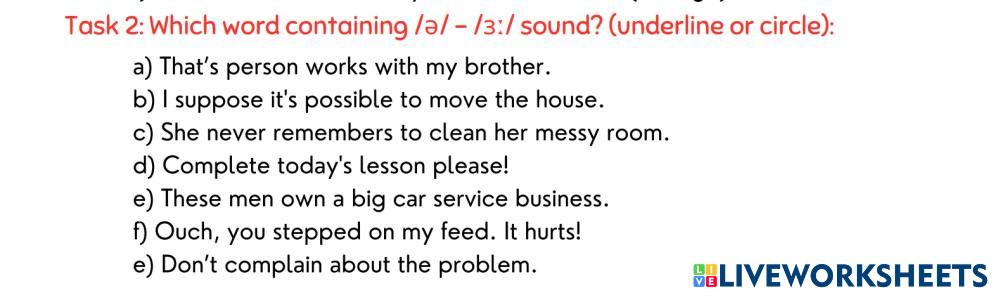 Created by DYNAMICCAMHW003 English homework Age 18+ level: a1 English Author's Instructions Chọn những âm / /ə/ và /ɜː/ My Google Classroom Courses × 0 classes selected (0 students total) Quick Access Select all classes (0 classes) All Classes Loading courses... Cancel Share Share to selected Course __COURSE_NAME__ __STUDENT_NAME__ (__STUDENT_EMAIL__) Homework pronunciation Download Worksheet Validation Check my answers Emails my answers to my teacher Full name Group/level School subject Teacher's email or key code Close Submit Validating worksheet... (12) Your answers have been sent to your teacher. Good luck! OK We encountered an error submitting your answers. Please try again. OK Advertisement | Go Ad Free Created by DYNAMICCAMHW003 English homework Age 18+ level: a1 English Author's Instructions Chọn những âm / /ə/ và /ɜː/