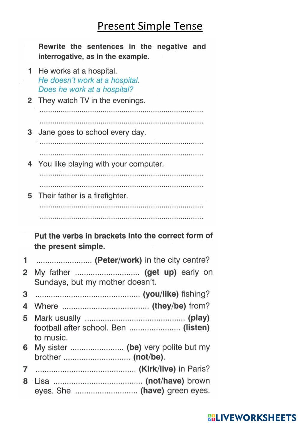 Created bySvetlana English grammar Age 10-16 level: 12 English Author's Instructions My Google Classroom Courses × 0 classes selected (0 students total) Quick Access Select all classes (0 classes) All Classes Loading courses... Cancel Share Share to selected Course __COURSE_NAME__ __STUDENT_NAME__ (__STUDENT_EMAIL__) Present Simple Tense Download Worksheet Validation Check my answers Emails my answers to my teacher Full name Group/level School subject Teacher's email or key code Close Submit Validating worksheet... (12) Your answers have been sent to your teacher. Good luck! OK We encountered an error submitting your answers. Please try again. OK Advertisement | Go Ad Free Created bySvetlana English grammar Age 10-16 level: 12 English Author's Instructions