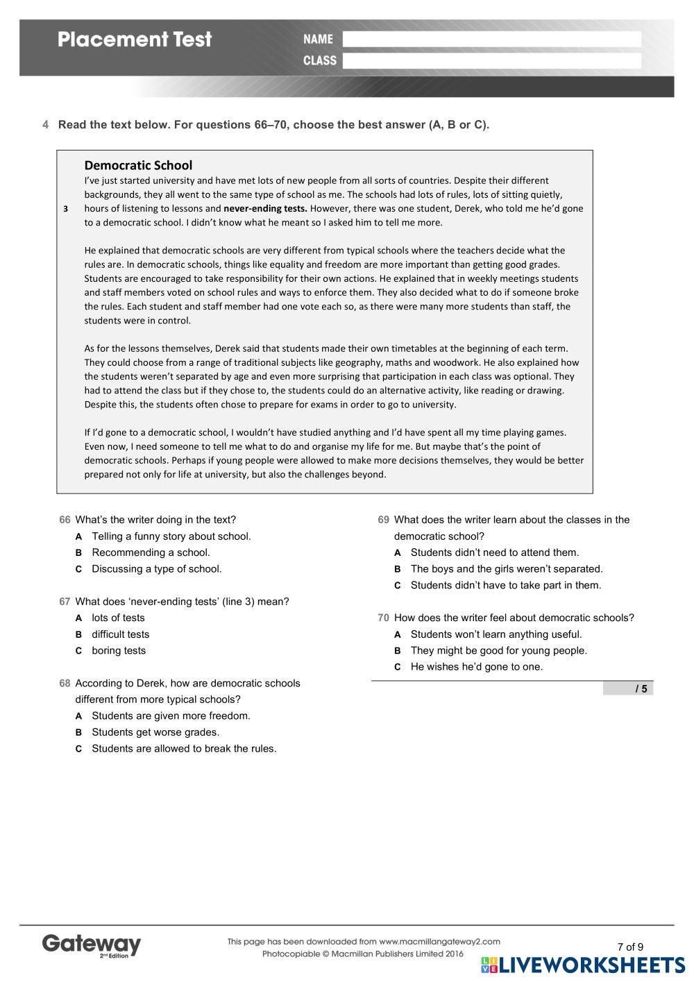 Created by Lolly_language1012 English Test Age 13-17 level: B1 English Author's Instructions My Google Classroom Courses × 0 classes selected (0 students total) Quick Access Select all classes (0 classes) All Classes Loading courses... Cancel Share Share to selected Course __COURSE_NAME__ __STUDENT_NAME__ (__STUDENT_EMAIL__) Placement tests 8 class Download Worksheet Validation Check my answers Emails my answers to my teacher Full name Group/level School subject Teacher's email or key code Close Submit Validating worksheet... (12) Your answers have been sent to your teacher. Good luck! OK We encountered an error submitting your answers. Please try again. OK Advertisement | Go Ad Free Created by Lolly_language1012 English Test Age 13-17 level: B1 English Author's Instructions