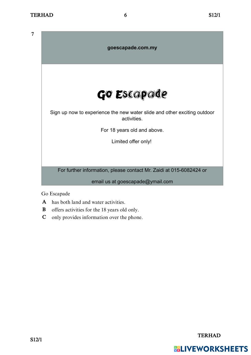 Created byNUR SABRINA NAJAT BINTI KHAIRUL ANWAR English Reading comprehension Age 13+ level: Intermediate English Author's Instructions My Google Classroom Courses × 0 classes selected (0 students total) Quick Access Select all classes (0 classes) All Classes Loading courses... Cancel Share Share to selected Course __COURSE_NAME__ __STUDENT_NAME__ (__STUDENT_EMAIL__) FORM 1 ENGLISH PAPER 1 REVISION Download Worksheet Validation Check my answers Emails my answers to my teacher Full name Group/level School subject Teacher's email or key code Close Submit Validating worksheet... (12) Your answers have been sent to your teacher. Good luck! OK We encountered an error submitting your answers. Please try again. OK Advertisement | Go Ad Free Created byNUR SABRINA NAJAT BINTI KHAIRUL ANWAR English Reading comprehension Age 13+ level: Intermediate English Author's Instructions