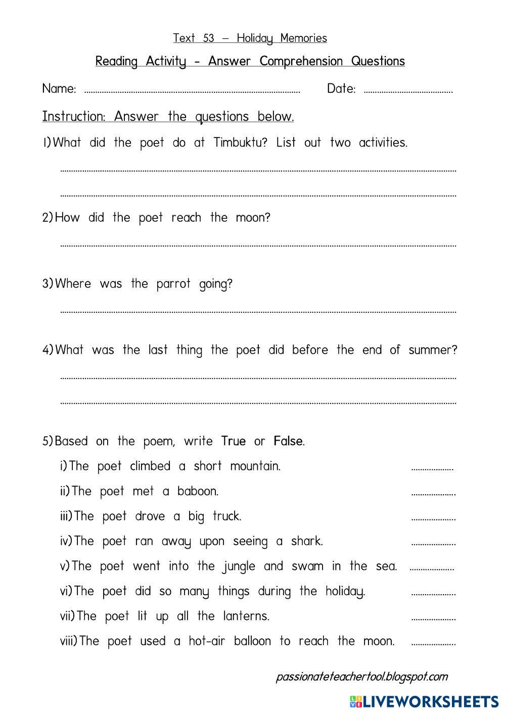 Created by anisz242 English Reading Comprehension Age 9-13 level: Easy English Author's Instructions Holiday Memories Poem Year 4 My Google Classroom Courses × 0 classes selected (0 students total) Quick Access Select all classes (0 classes) All Classes Loading courses... Cancel Share Share to selected Course __COURSE_NAME__ __STUDENT_NAME__ (__STUDENT_EMAIL__) HOLIDAY MEMORIES Download Worksheet Validation Check my answers Emails my answers to my teacher Full name Group/level School subject Teacher's email or key code Close Submit Validating worksheet... (12) Your answers have been sent to your teacher. Good luck! OK We encountered an error submitting your answers. Please try again. OK Advertisement | Go Ad Free Created by anisz242 English Reading Comprehension Age 9-13 level: Easy English Author's Instructions Holiday Memories Poem Year 4