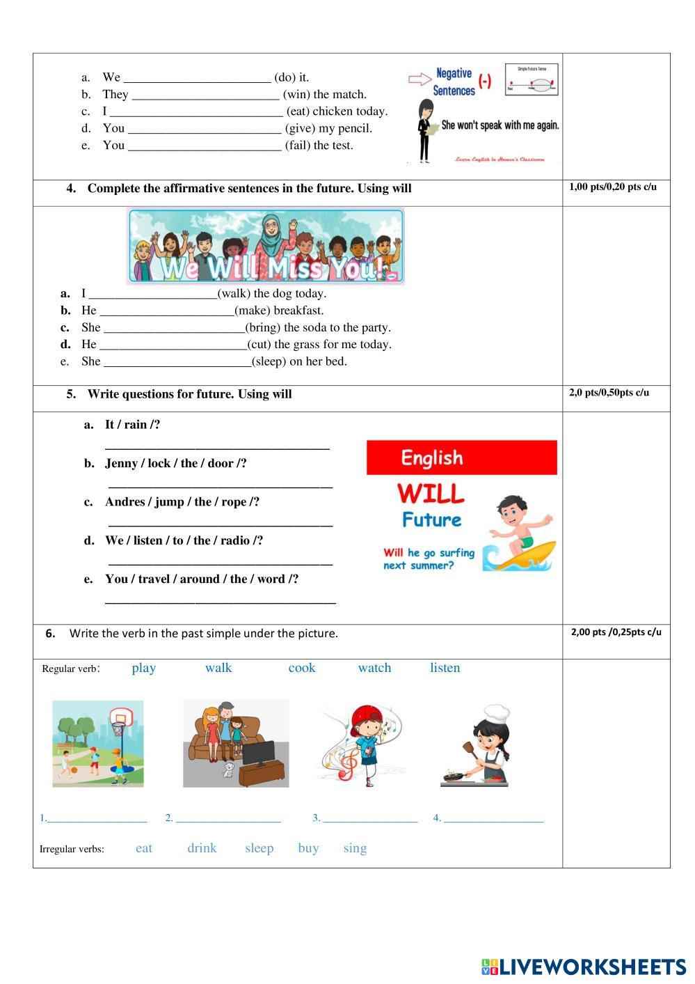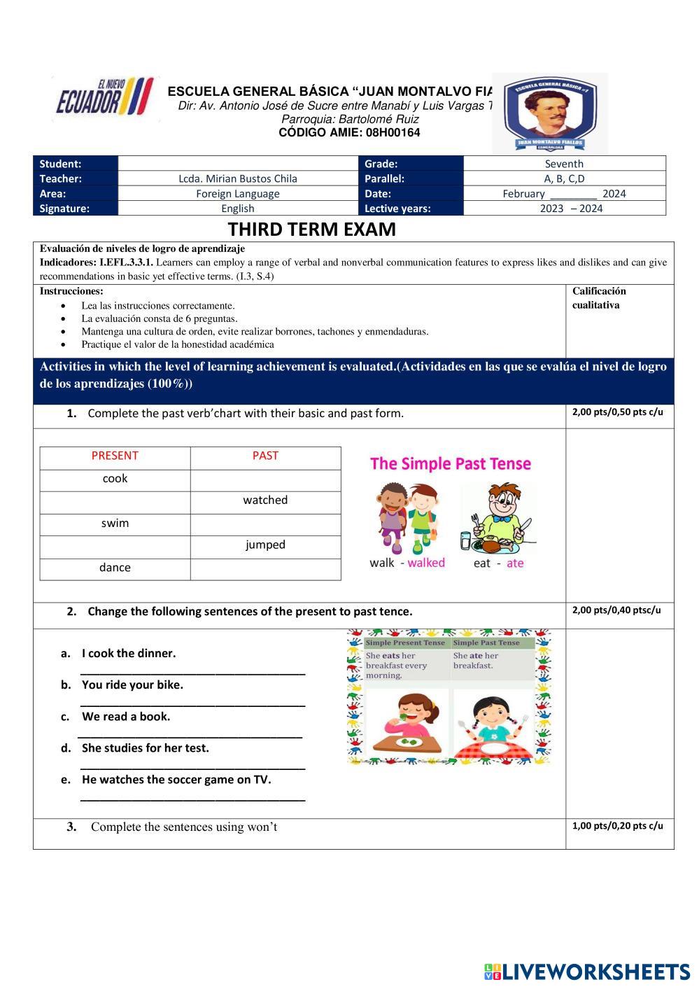 Created byMIRIAN VERONICA BUSTOS CHILA ENGLISH EXAM Age 10-15 level: basico English Author's Instructions EVALUACION DEL TERCER TRIMESTRE My Google Classroom Courses × 0 classes selected (0 students total) Quick Access Select all classes (0 classes) All Classes Loading courses... Cancel Share Share to selected Course __COURSE_NAME__ __STUDENT_NAME__ (__STUDENT_EMAIL__) THIRD TERM EXAM Download Worksheet Validation Check my answers Emails my answers to my teacher Full name Group/level School subject Teacher's email or key code Close Submit Validating worksheet... (12) Your answers have been sent to your teacher. Good luck! OK We encountered an error submitting your answers. Please try again. OK Advertisement | Go Ad Free Created byMIRIAN VERONICA BUSTOS CHILA ENGLISH EXAM Age 10-15 level: basico English Author's Instructions EVALUACION DEL TERCER TRIMESTRE