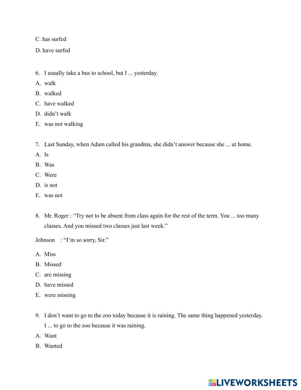 Created byAfrian Restu Utama English Past Tenses Age 14+ level: 10 Grade English Author's Instructions My Google Classroom Courses × 0 classes selected (0 students total) Quick Access Select all classes (0 classes) All Classes Loading courses... Cancel Share Share to selected Course __COURSE_NAME__ __STUDENT_NAME__ (__STUDENT_EMAIL__) Tenses Worksheets Download Worksheet Validation Check my answers Emails my answers to my teacher Full name Group/level School subject Teacher's email or key code Close Submit Validating worksheet... (12) Your answers have been sent to your teacher. Good luck! OK We encountered an error submitting your answers. Please try again. OK Advertisement | Go Ad Free Created byAfrian Restu Utama English Past Tenses Age 14+ level: 10 Grade English Author's Instructions