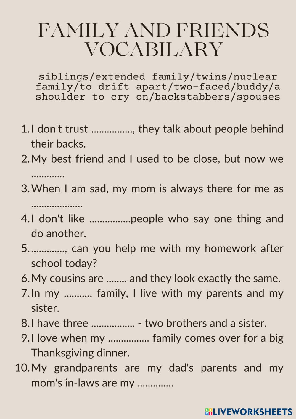 Created by romantsova English Vocabulary Age 6+ level: A1 English Author's Instructions My Google Classroom Courses × 0 classes selected (0 students total) Quick Access Select all classes (0 classes) All Classes Loading courses... Cancel Share Share to selected Course __COURSE_NAME__ __STUDENT_NAME__ (__STUDENT_EMAIL__) Family and Friends Download Worksheet Validation Check my answers Emails my answers to my teacher Full name Group/level School subject Teacher's email or key code Close Submit Validating worksheet... (12) Your answers have been sent to your teacher. Good luck! OK We encountered an error submitting your answers. Please try again. OK Advertisement | Go Ad Free Created by romantsova English Vocabulary Age 6+ level: A1 English Author's Instructions