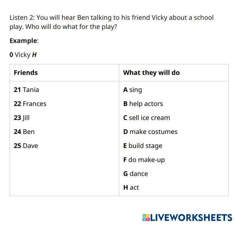 Created byNguyen thi Thanh Thuy English Listening Age 14+ level: A2 English Author's Instructions My Google Classroom Courses × 0 classes selected (0 students total) Quick Access Select all classes (0 classes) All Classes Loading courses... Cancel Share Share to selected Course __COURSE_NAME__ __STUDENT_NAME__ (__STUDENT_EMAIL__) KET PRACTICE Download Worksheet Validation Check my answers Emails my answers to my teacher Full name Group/level School subject Teacher's email or key code Close Submit Validating worksheet... (12) Your answers have been sent to your teacher. Good luck! OK We encountered an error submitting your answers. Please try again. OK Advertisement | Go Ad Free Created byNguyen thi Thanh Thuy English Listening Age 14+ level: A2 English Author's Instructions