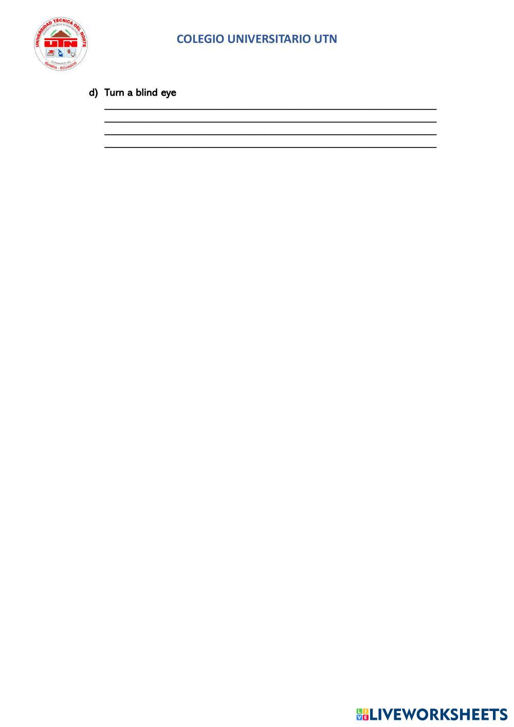 Created by Deysi_Chimarro ENGLISH Idioms Age 17+ level: B1.2 English Author's Instructions My Google Classroom Courses × 0 classes selected (0 students total) Quick Access Select all classes (0 classes) All Classes Loading courses... Cancel Share Share to selected Course __COURSE_NAME__ __STUDENT_NAME__ (__STUDENT_EMAIL__) Chimarro Deysi Download Worksheet Validation Check my answers Emails my answers to my teacher Full name Group/level School subject Teacher's email or key code Close Submit Validating worksheet... (12) Your answers have been sent to your teacher. Good luck! OK We encountered an error submitting your answers. Please try again. OK Advertisement | Go Ad Free Created by Deysi_Chimarro ENGLISH Idioms Age 17+ level: B1.2 English Author's Instructions