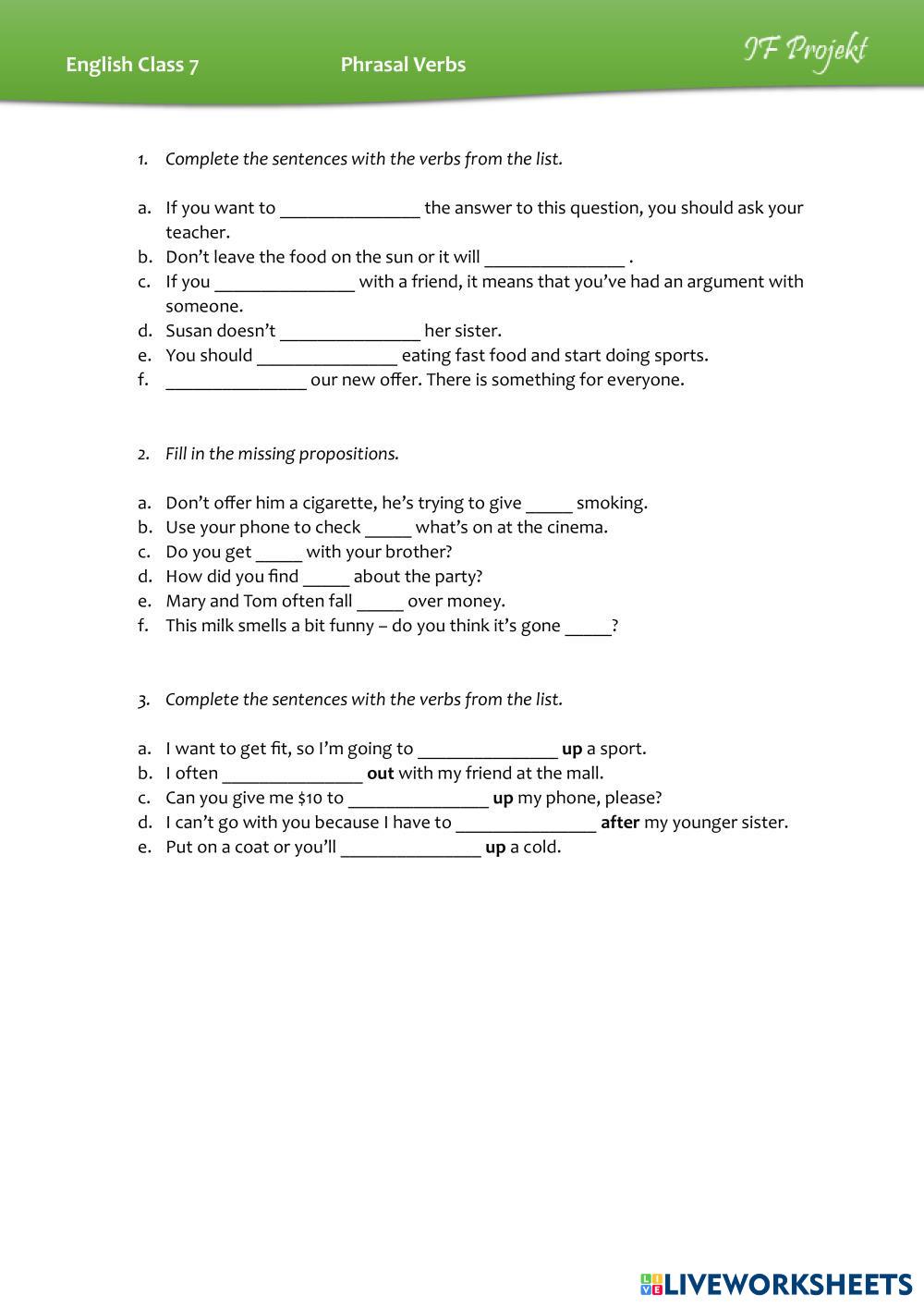 Created by ilafendi English phrasal verbs Age 12+ level: A2+ English Author's Instructions My Google Classroom Courses × 0 classes selected (0 students total) Quick Access Select all classes (0 classes) All Classes Loading courses... Cancel Share Share to selected Course __COURSE_NAME__ __STUDENT_NAME__ (__STUDENT_EMAIL__) Phrasal Verbs from English Class 4 Download Worksheet Validation Check my answers Emails my answers to my teacher Full name Group/level School subject Teacher's email or key code Close Submit Validating worksheet... (12) Your answers have been sent to your teacher. Good luck! OK We encountered an error submitting your answers. Please try again. OK Advertisement | Go Ad Free Created by ilafendi English phrasal verbs Age 12+ level: A2+ English Author's Instructions