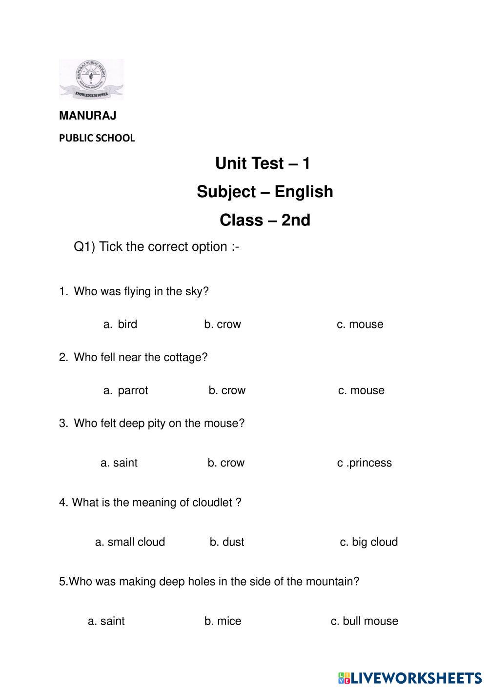 Created bysamarth ENGLISH MCQ Age 10-14 level: 2 English Author's Instructions My Google Classroom Courses × 0 classes selected (0 students total) Quick Access Select all classes (0 classes) All Classes Loading courses... Cancel Share Share to selected Course __COURSE_NAME__ __STUDENT_NAME__ (__STUDENT_EMAIL__) ENGLISH Download Worksheet Validation Check my answers Emails my answers to my teacher Full name Group/level School subject Teacher's email or key code Close Submit Validating worksheet... (12) Your answers have been sent to your teacher. Good luck! OK We encountered an error submitting your answers. Please try again. OK Advertisement | Go Ad Free Created bysamarth ENGLISH MCQ Age 10-14 level: 2 English Author's Instructions