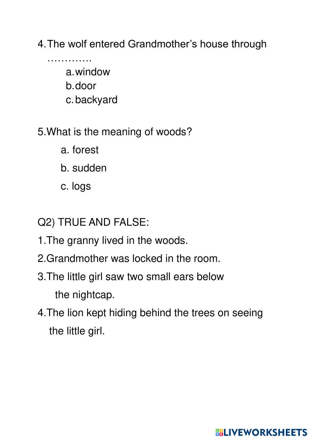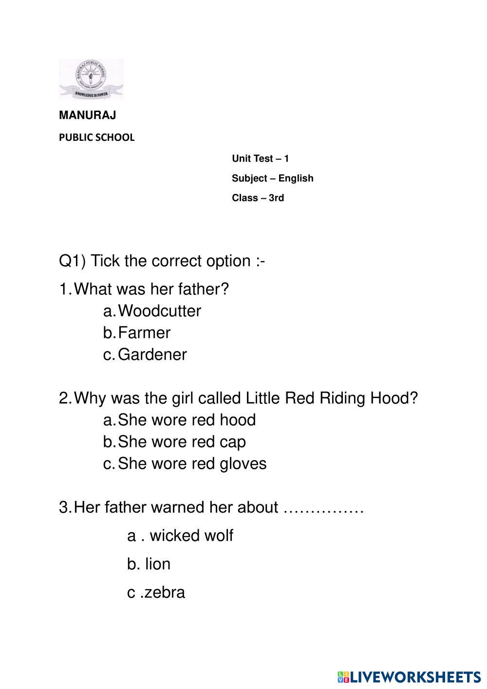 Created bysamarth English MCQ Age 8-13 level: 3 English Author's Instructions My Google Classroom Courses × 0 classes selected (0 students total) Quick Access Select all classes (0 classes) All Classes Loading courses... Cancel Share Share to selected Course __COURSE_NAME__ __STUDENT_NAME__ (__STUDENT_EMAIL__) unit test 1 Download Worksheet Validation Check my answers Emails my answers to my teacher Full name Group/level School subject Teacher's email or key code Close Submit Validating worksheet... (12) Your answers have been sent to your teacher. Good luck! OK We encountered an error submitting your answers. Please try again. OK Advertisement | Go Ad Free Created bysamarth English MCQ Age 8-13 level: 3 English Author's Instructions