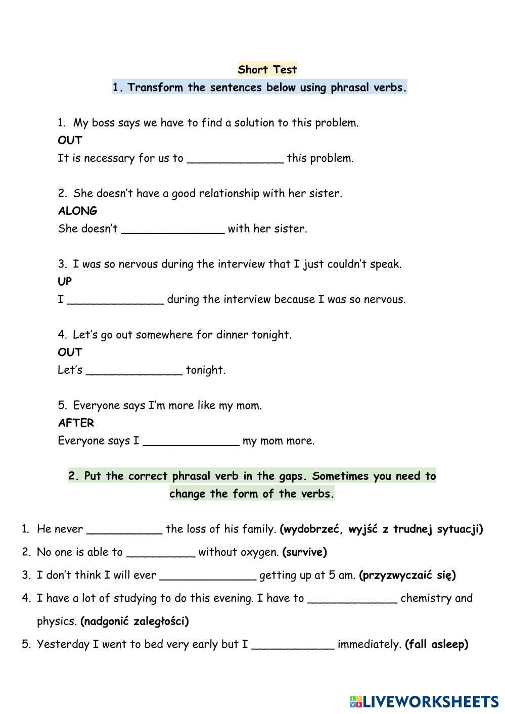 Created by Maddeline79 English Vocabulary Age 16+ level: B2 English Author's Instructions My Google Classroom Courses × 0 classes selected (0 students total) Quick Access Select all classes (0 classes) All Classes Loading courses... Cancel Share Share to selected Course __COURSE_NAME__ __STUDENT_NAME__ (__STUDENT_EMAIL__) Phrasal verbs Download Worksheet Validation Check my answers Emails my answers to my teacher Full name Group/level School subject Teacher's email or key code Close Submit Validating worksheet... (12) Your answers have been sent to your teacher. Good luck! OK We encountered an error submitting your answers. Please try again. OK Advertisement | Go Ad Free Created by Maddeline79 English Vocabulary Age 16+ level: B2 English Author's Instructions