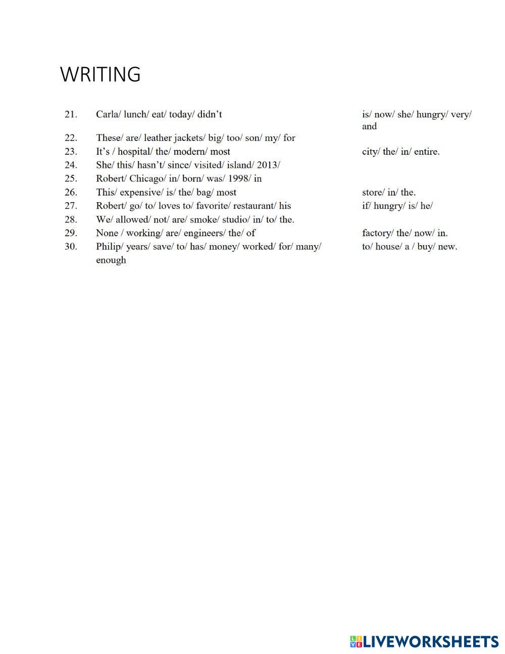 Created byNBTK ENGLISH WRITING 1 Age 18+ level: PRE English Author's Instructions My Google Classroom Courses × 0 classes selected (0 students total) Quick Access Select all classes (0 classes) All Classes Loading courses... Cancel Share Share to selected Course __COURSE_NAME__ __STUDENT_NAME__ (__STUDENT_EMAIL__) CDR-WRITING 1 Part 1 - 21-30 Download Worksheet Validation Check my answers Emails my answers to my teacher Full name Group/level School subject Teacher's email or key code Close Submit Validating worksheet... (12) Your answers have been sent to your teacher. Good luck! OK We encountered an error submitting your answers. Please try again. OK Advertisement | Go Ad Free Created byNBTK ENGLISH WRITING 1 Age 18+ level: PRE English Author's Instructions