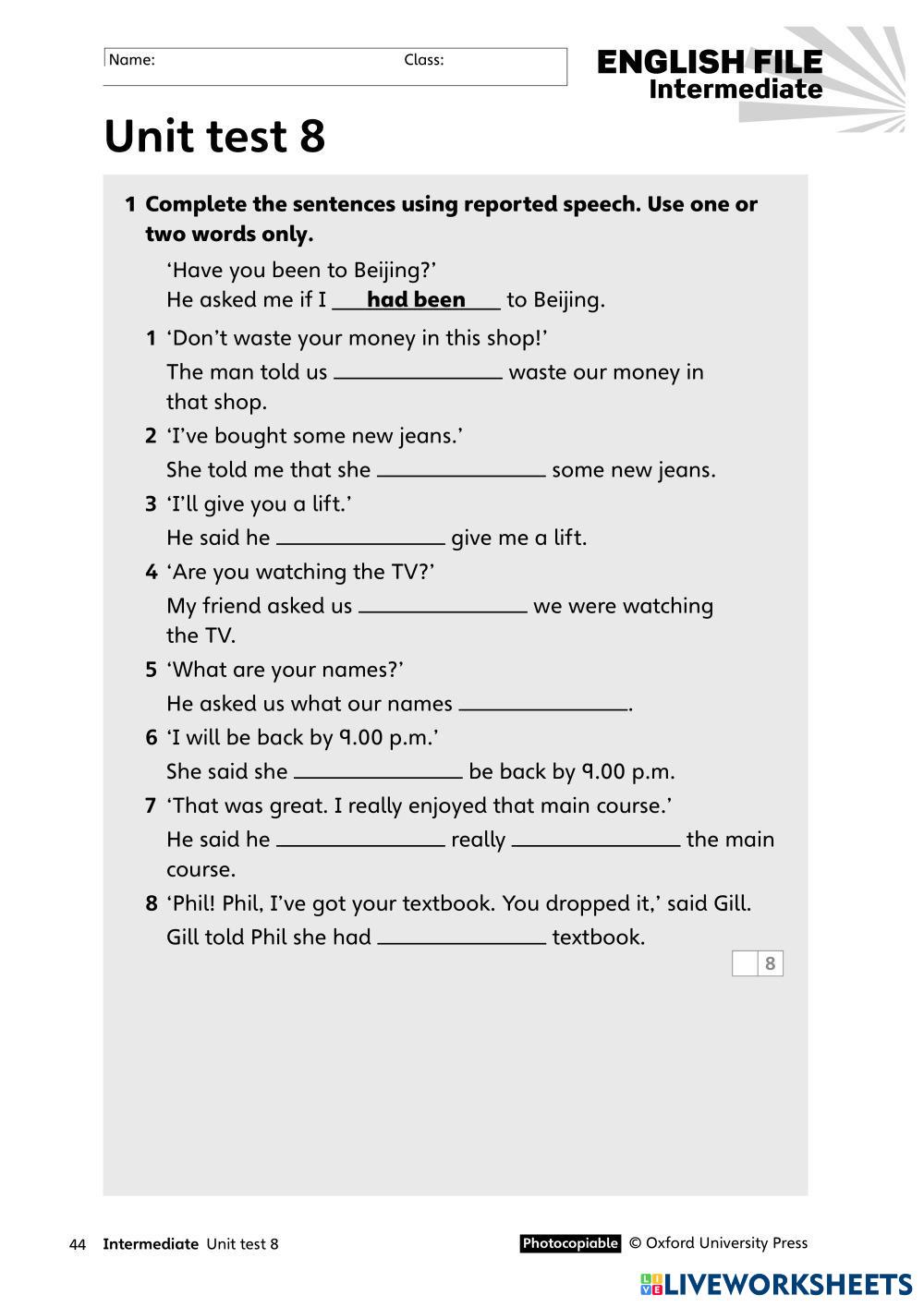 Created byElizaveta English Intermediate Age 13+ level: Intermediate English Author's Instructions My Google Classroom Courses × 0 classes selected (0 students total) Quick Access Select all classes (0 classes) All Classes Loading courses... Cancel Share Share to selected Course __COURSE_NAME__ __STUDENT_NAME__ (__STUDENT_EMAIL__) Test units 7&8 Download Worksheet Validation Check my answers Emails my answers to my teacher Full name Group/level School subject Teacher's email or key code Close Submit Validating worksheet... (12) Your answers have been sent to your teacher. Good luck! OK We encountered an error submitting your answers. Please try again. OK Advertisement | Go Ad Free Created byElizaveta English Intermediate Age 13+ level: Intermediate English Author's Instructions