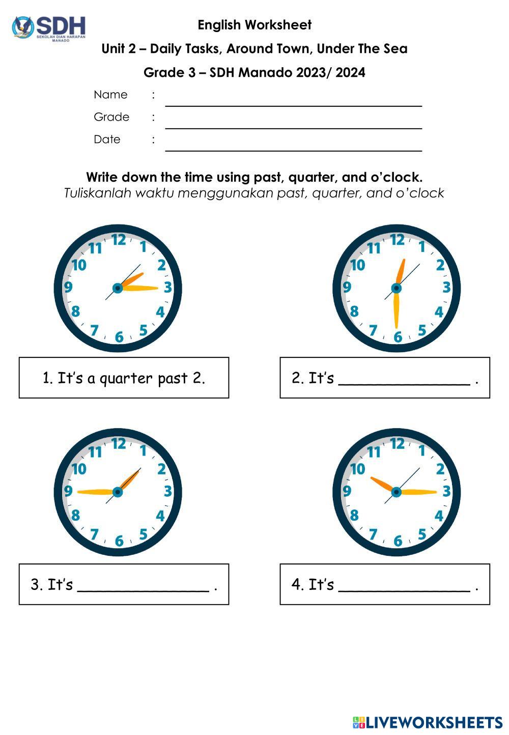 Created byApriyanti Monalisa English Quarter to, Quarter past, Half past, O'clock. Age 8-13 level: Grade 3 English Author's Instructions My Google Classroom Courses × 0 classes selected (0 students total) Quick Access Select all classes (0 classes) All Classes Loading courses... Cancel Share Share to selected Course __COURSE_NAME__ __STUDENT_NAME__ (__STUDENT_EMAIL__) Reading Clock Worksheet Download Worksheet Validation Check my answers Emails my answers to my teacher Full name Group/level School subject Teacher's email or key code Close Submit Validating worksheet... (12) Your answers have been sent to your teacher. Good luck! OK We encountered an error submitting your answers. Please try again. OK Advertisement | Go Ad Free Created byApriyanti Monalisa English Quarter to, Quarter past, Half past, O'clock. Age 8-13 level: Grade 3 English Author's Instructions