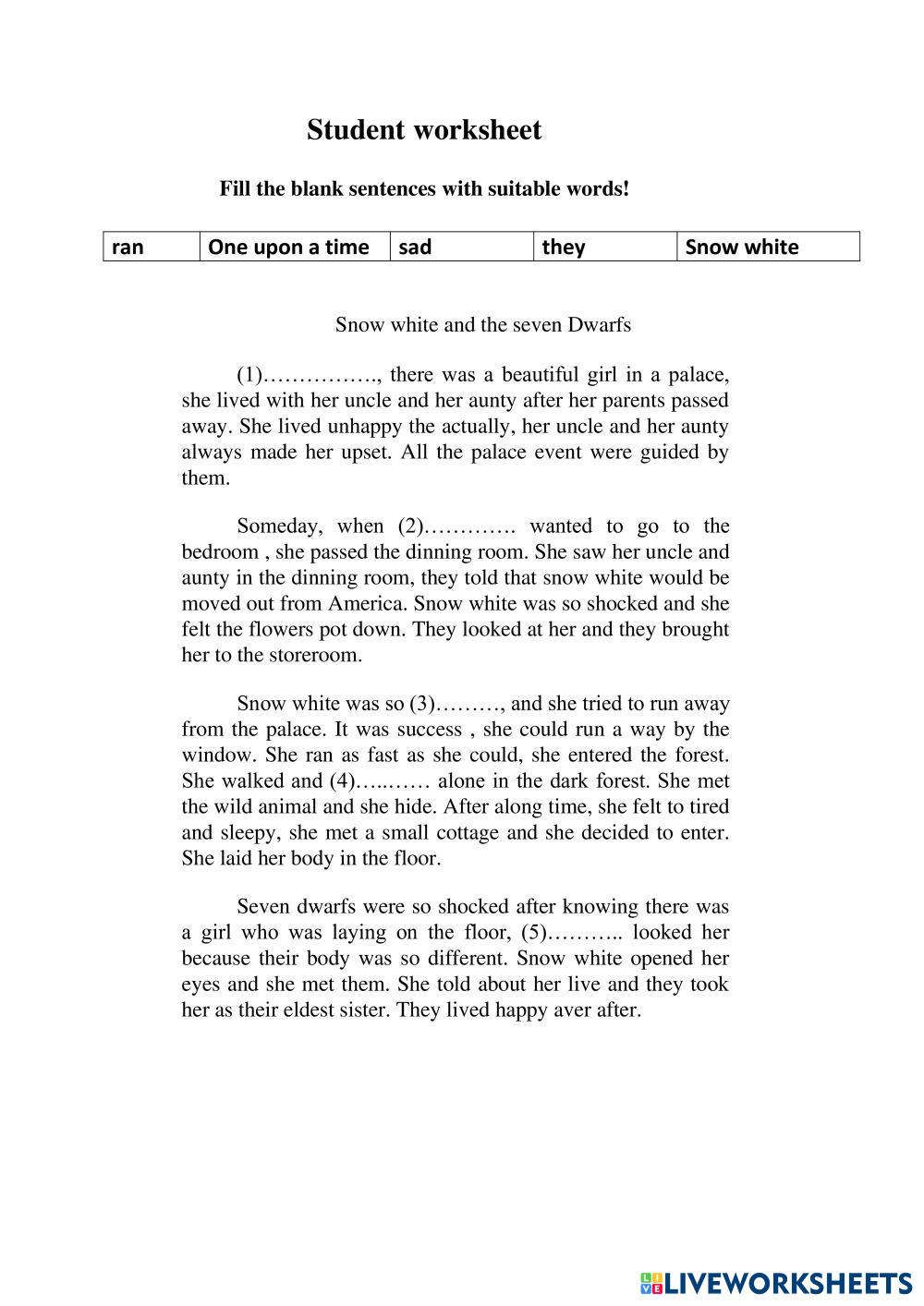 Created bysuryanizahraani English Fairy Tales Age 13-17 level: 8 English Author's Instructions My Google Classroom Courses × 0 classes selected (0 students total) Quick Access Select all classes (0 classes) All Classes Loading courses... Cancel Share Share to selected Course __COURSE_NAME__ __STUDENT_NAME__ (__STUDENT_EMAIL__) Narrative text 2 Download Worksheet Validation Check my answers Emails my answers to my teacher Full name Group/level School subject Teacher's email or key code Close Submit Validating worksheet... (12) Your answers have been sent to your teacher. Good luck! OK We encountered an error submitting your answers. Please try again. OK Advertisement | Go Ad Free Created bysuryanizahraani English Fairy Tales Age 13-17 level: 8 English Author's Instructions
