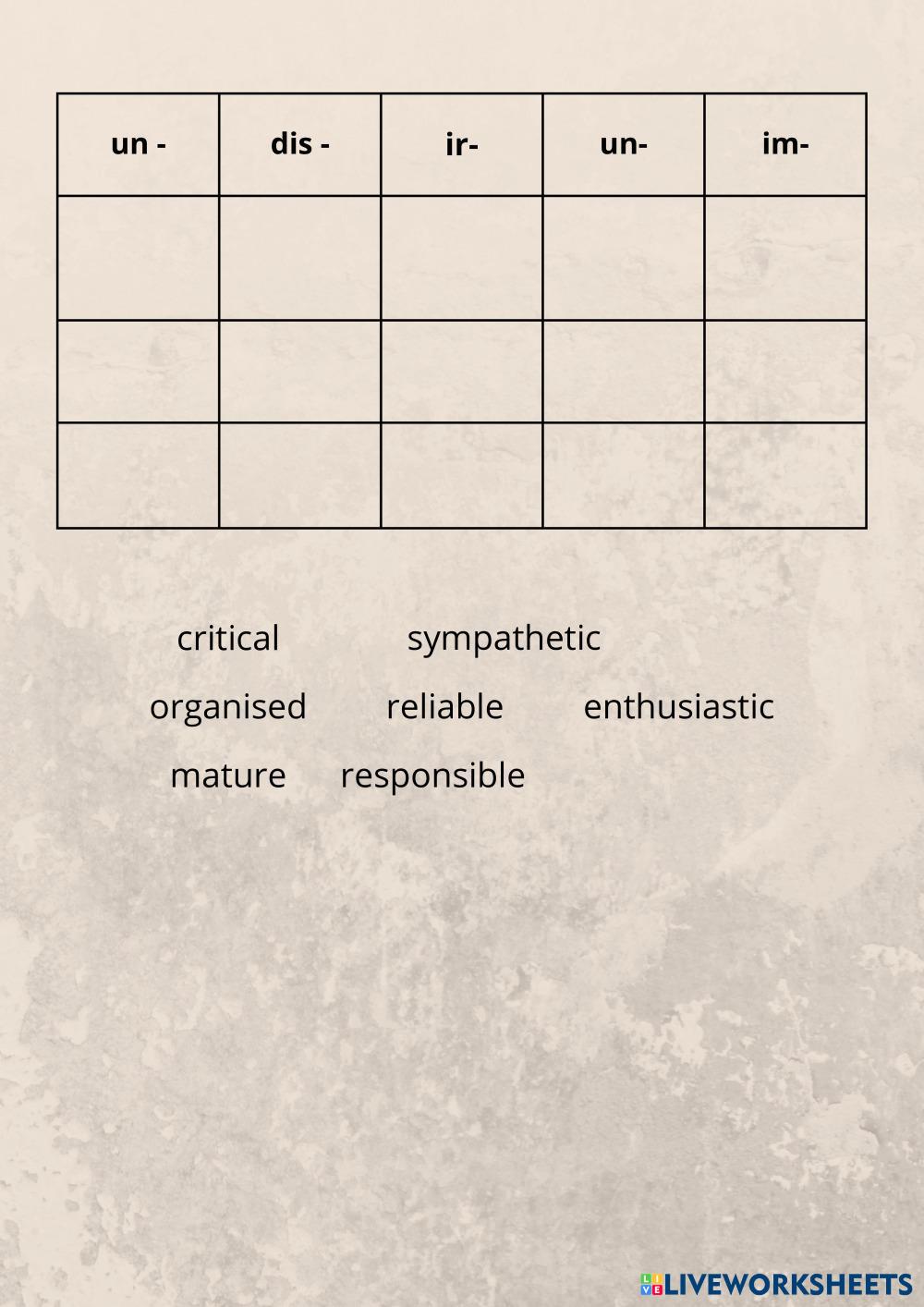 Choose the correct prefix to make an adjective with the opposite meaning