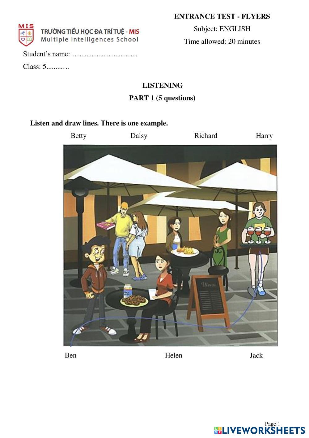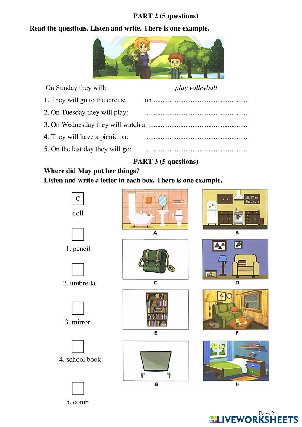 Created byEnglish English Flyers Listening Test 4 Age 6-14 level: A2 English Author's Instructions My Google Classroom Courses × 0 classes selected (0 students total) Quick Access Select all classes (0 classes) All Classes Loading courses... Cancel Share Share to selected Course __COURSE_NAME__ __STUDENT_NAME__ (__STUDENT_EMAIL__) Entrance Test 1- Flyers Download Worksheet Validation Check my answers Emails my answers to my teacher Full name Group/level School subject Teacher's email or key code Close Submit Validating worksheet... (12) Your answers have been sent to your teacher. Good luck! OK We encountered an error submitting your answers. Please try again. OK Advertisement | Go Ad Free Created byEnglish English Flyers Listening Test 4 Age 6-14 level: A2 English Author's Instructions