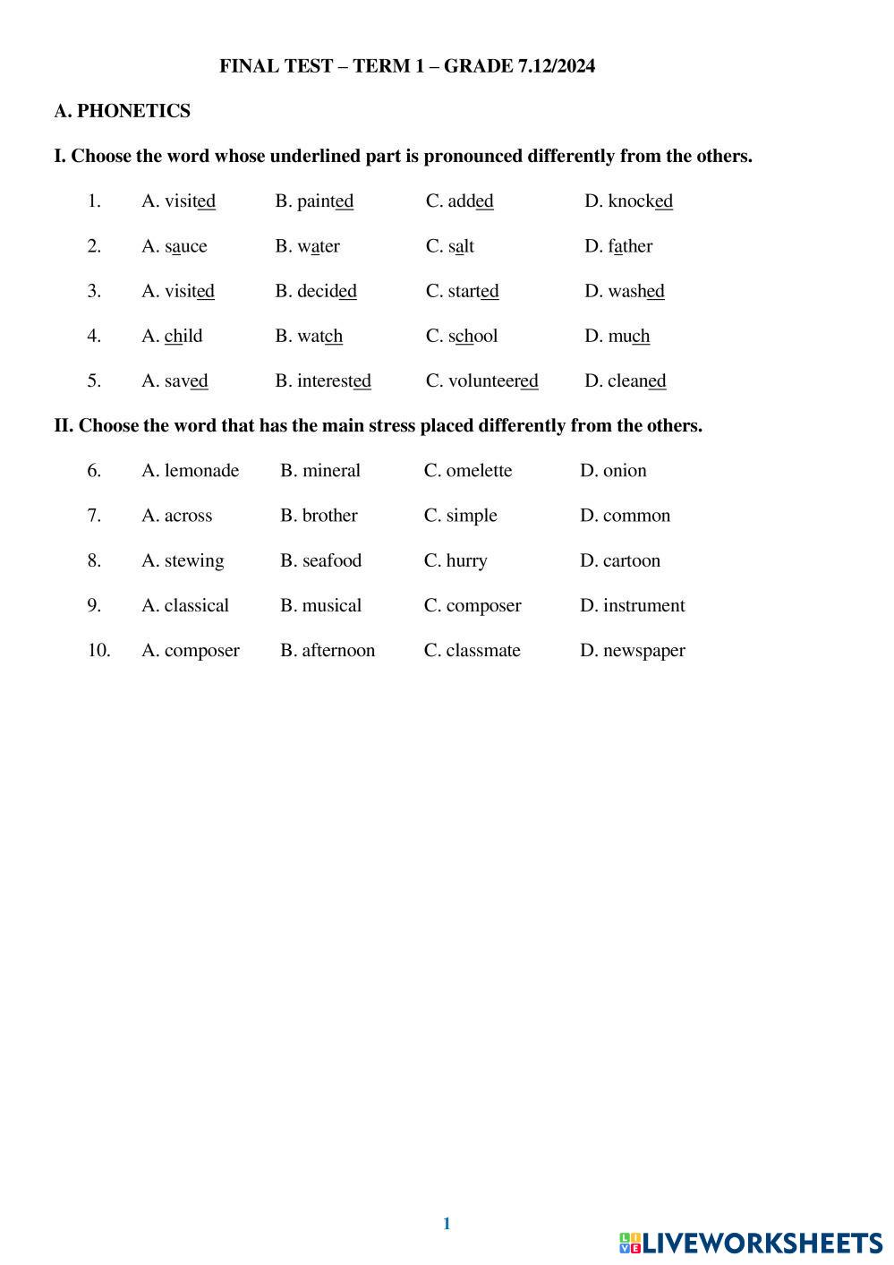 Created by Lilybui english english Age 11-15 level: 7 English Author's Instructions My Google Classroom Courses × 0 classes selected (0 students total) Quick Access Select all classes (0 classes) All Classes Loading courses... Cancel Share Share to selected Course __COURSE_NAME__ __STUDENT_NAME__ (__STUDENT_EMAIL__) E7.cuối kỳ 1.2024.1 Download Worksheet Validation Check my answers Emails my answers to my teacher Full name Group/level School subject Teacher's email or key code Close Submit Validating worksheet... (12) Your answers have been sent to your teacher. Good luck! OK We encountered an error submitting your answers. Please try again. OK Advertisement | Go Ad Free Created by Lilybui english english Age 11-15 level: 7 English Author's Instructions