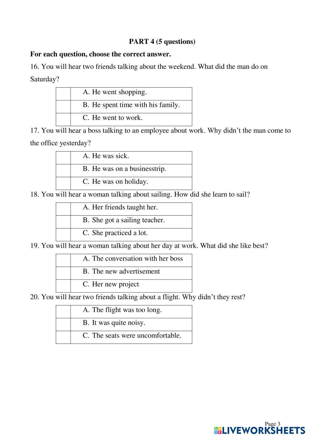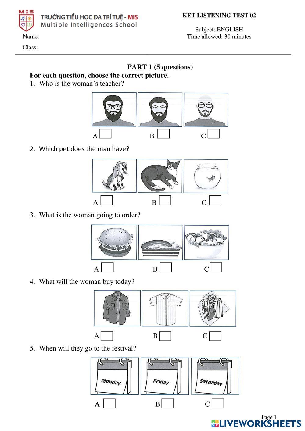Created byEnglish English KET listening test Age 6-15 level: Pre-A1 English Author's Instructions My Google Classroom Courses × 0 classes selected (0 students total) Quick Access Select all classes (0 classes) All Classes Loading courses... Cancel Share Share to selected Course __COURSE_NAME__ __STUDENT_NAME__ (__STUDENT_EMAIL__) KET LISTENING TEST 02 Download Worksheet Validation Check my answers Emails my answers to my teacher Full name Group/level School subject Teacher's email or key code Close Submit Validating worksheet... (12) Your answers have been sent to your teacher. Good luck! OK We encountered an error submitting your answers. Please try again. OK Advertisement | Go Ad Free Created byEnglish English KET listening test Age 6-15 level: Pre-A1 English Author's Instructions