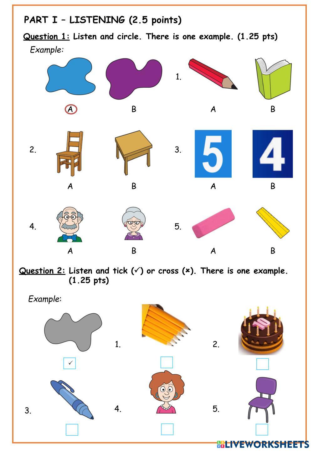 Created by Lilybui english english Age 6-10 level: 1 English Author's Instructions My Google Classroom Courses × 0 classes selected (0 students total) Quick Access Select all classes (0 classes) All Classes Loading courses... Cancel Share Share to selected Course __COURSE_NAME__ __STUDENT_NAME__ (__STUDENT_EMAIL__) E1.Test cuối kỳ 1. Đề 1.12.2024 Download Worksheet Validation Check my answers Emails my answers to my teacher Full name Group/level School subject Teacher's email or key code Close Submit Validating worksheet... (12) Your answers have been sent to your teacher. Good luck! OK We encountered an error submitting your answers. Please try again. OK Advertisement | Go Ad Free Created by Lilybui english english Age 6-10 level: 1 English Author's Instructions