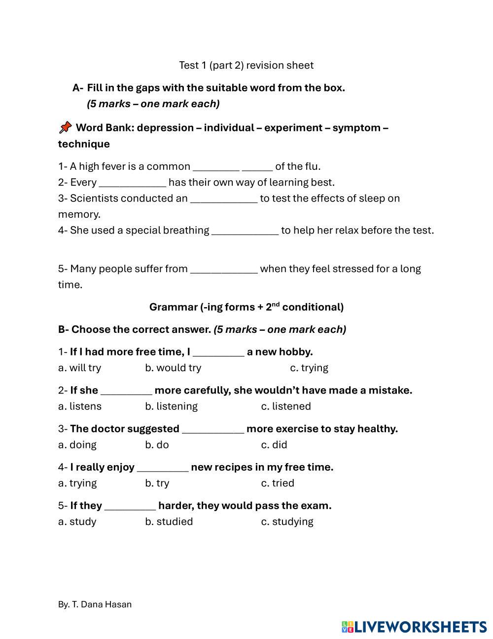 Created byDana Hasan Makawi Mohamed Ali ESL grade 12 Reading skills test taking skills Age 15-18 level: grade 12 English Author's Instructions My Google Classroom Courses × 0 classes selected (0 students total) Quick Access Select all classes (0 classes) All Classes Loading courses... Cancel Share Share to selected Course __COURSE_NAME__ __STUDENT_NAME__ (__STUDENT_EMAIL__) vocab gramma rrevision Download Worksheet Validation Check my answers Emails my answers to my teacher Full name Group/level School subject Teacher's email or key code Close Submit Validating worksheet... (12) Your answers have been sent to your teacher. Good luck! OK We encountered an error submitting your answers. Please try again. OK Advertisement | Go Ad Free Created byDana Hasan Makawi Mohamed Ali ESL grade 12 Reading skills test taking skills Age 15-18 level: grade 12 English Author's Instructions