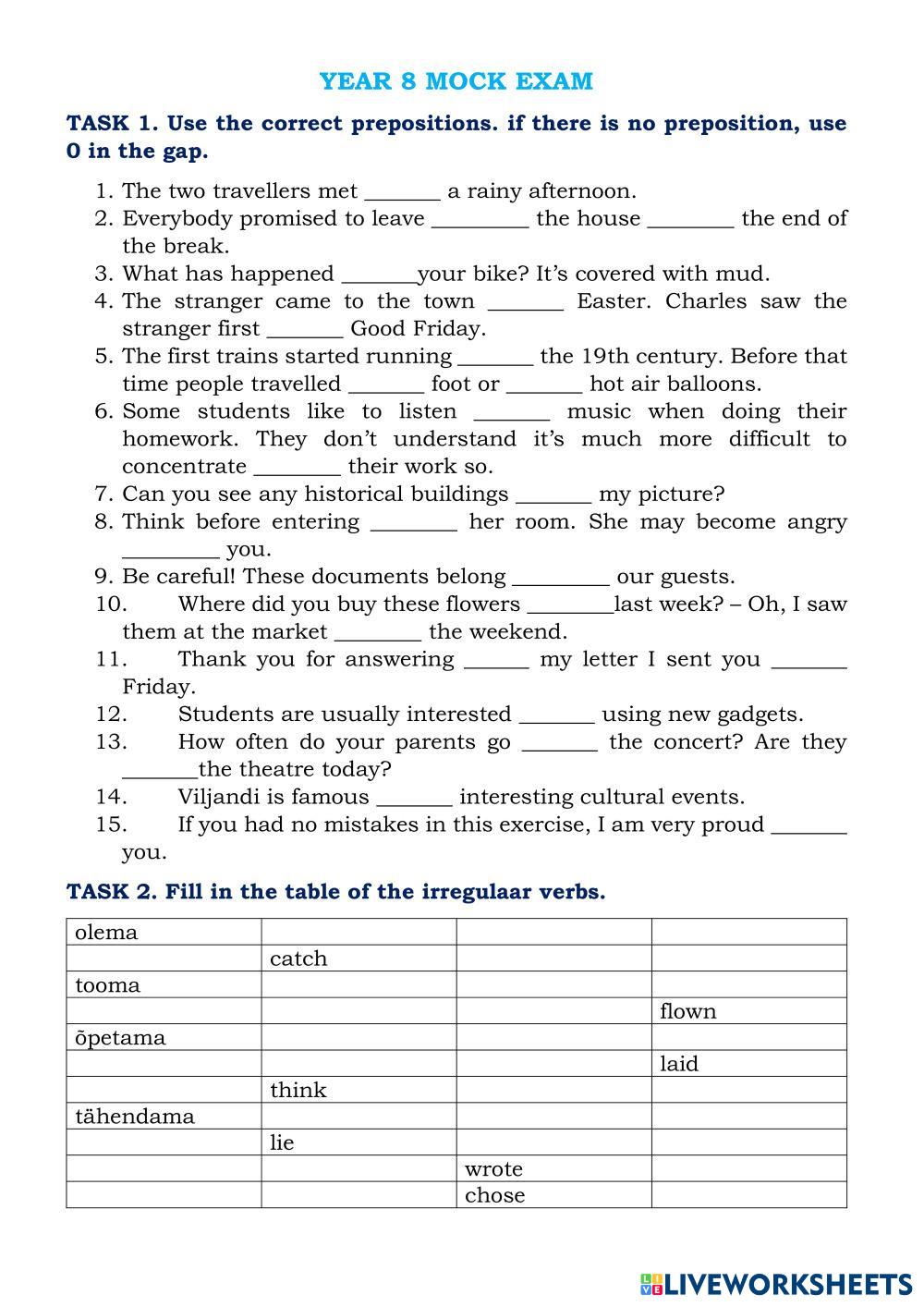 Created by marjemee ESL English B1-Intermediate Grammar English Author's Instructions Fill in the gaps. Do not use short forms of verbs. My Google Classroom Courses × 0 classes selected (0 students total) Quick Access Select all classes (0 classes) All Classes Loading courses... Cancel Share Share to selected Course __COURSE_NAME__ __STUDENT_NAME__ (__STUDENT_EMAIL__) Year 8 Mock Exam Download Worksheet Validation Check my answers Emails my answers to my teacher Full name Group/level School subject Teacher's email or key code Close Submit Validating worksheet... (12) Your answers have been sent to your teacher. Good luck! OK We encountered an error submitting your answers. Please try again. OK Advertisement | Go Ad Free Created by marjemee ESL English B1-Intermediate Grammar English Author's Instructions Fill in the gaps. Do not use short forms of verbs. Explore Worksheets PRONUNCIATION– G7 – U1&2 – PART – III ESL B1-Intermediate PRONUNCIATION– G7 – U1&2 – PART – III Grammar - ESL PRONUNCIATION Present simple vs present continuous ESL B1-Intermediate Present simple vs present continuous Grammar - ESL English as a second language Present simple vs continuous grammar exercises Main content: Present simple and present continuous PRONUNCIATION– G7 – U1 – PART – II ESL B1-Intermediate PRONUNCIATION– G7 – U1 – PART – II Grammar - ESL PRONUNCIATION G7 - MULTIPLE CHOICE - U2 - PART - III ESL B1-Intermediate G7 - MULTIPLE CHOICE - U2 - PART - III Grammar - ESL MULTIPLE CHOICE