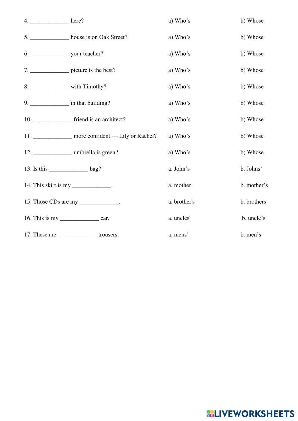 Created by bonnie81 ESL English A2-Elementary Grammar English Author's Instructions choose the correct the answer My Google Classroom Courses × 0 classes selected (0 students total) Quick Access Select all classes (0 classes) All Classes Loading courses... Cancel Share Share to selected Course __COURSE_NAME__ __STUDENT_NAME__ (__STUDENT_EMAIL__) Whose and Who's Download Worksheet Validation Check my answers Emails my answers to my teacher Full name Group/level School subject Teacher's email or key code Close Submit Validating worksheet... (12) Your answers have been sent to your teacher. Good luck! OK We encountered an error submitting your answers. Please try again. OK Advertisement | Go Ad Free Created by bonnie81 ESL English A2-Elementary Grammar English Author's Instructions choose the correct the answer Explore Worksheets Present Simple Tense ESL A2-Elementary Present Simple Tense Grammar - ESL English as a second language Two exercises to practise positive, negative and question form of present simple tense Present Simple vs Present Continuous ESL A2-Elementary Present Simple vs Present Continuous Grammar - ESL English as a second language Present simple and present continuous: Choose the correct verb form ADVERBS OF MANNER ESL A2-Elementary ADVERBS OF MANNER Grammar - ESL ADVERBS OF MANNER Past Simple - Regular and irregular verbs ESL A2-Elementary Past Simple - Regular and irregular verbs Grammar - ESL English as a second language Past simple - regular and irregular verbs. Affirmative and negative sentences, questions.