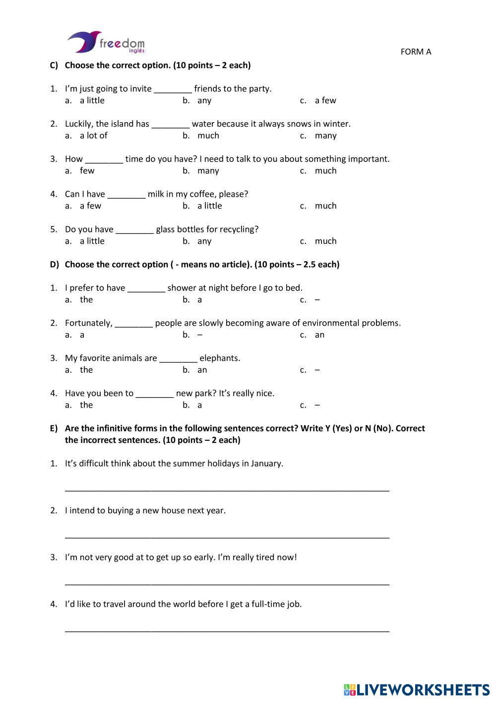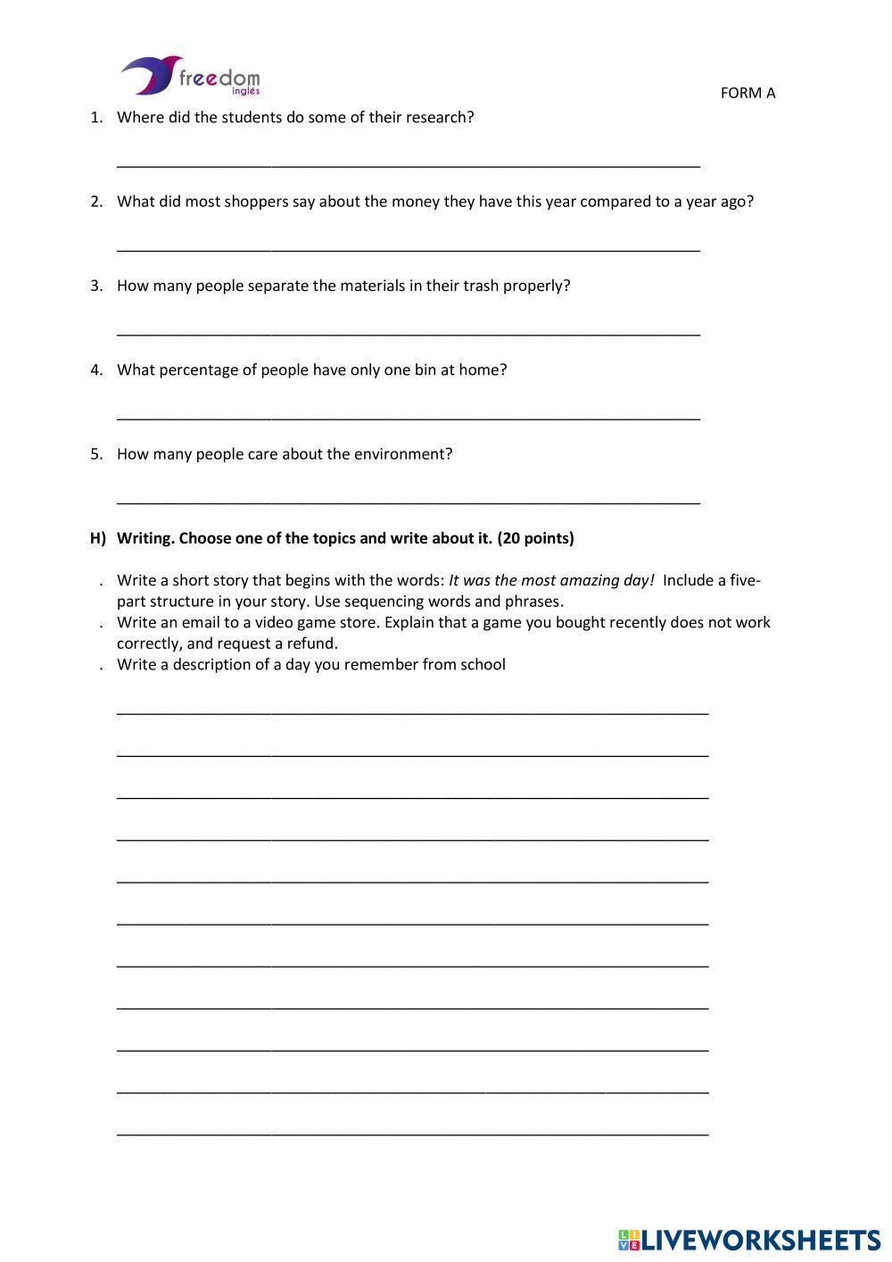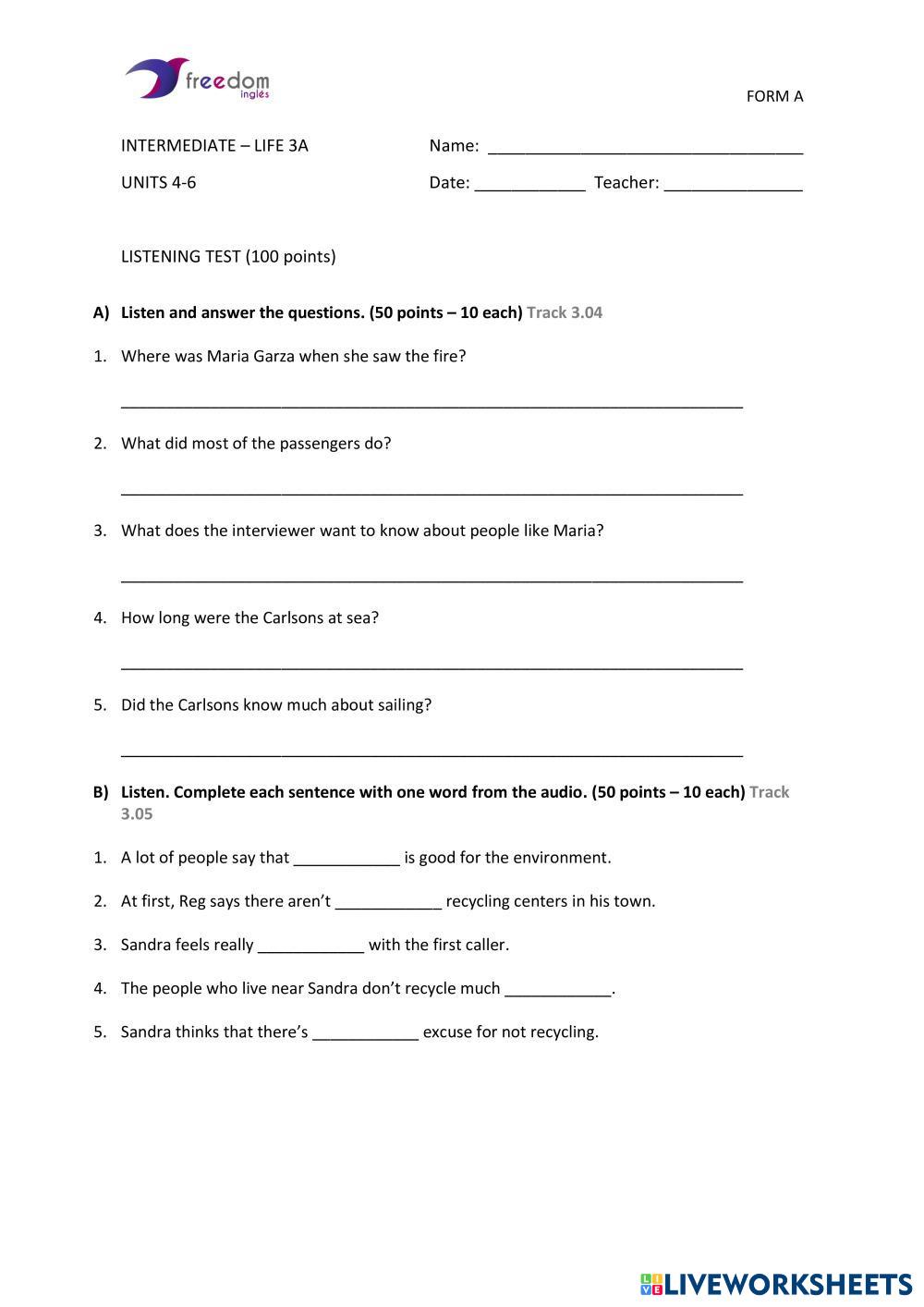 Created by aalmendras ESL English B1 Grammar English Author's Instructions Completar My Google Classroom Courses × 0 classes selected (0 students total) Quick Access Select all classes (0 classes) All Classes Loading courses... Cancel Share Share to selected Course __COURSE_NAME__ __STUDENT_NAME__ (__STUDENT_EMAIL__) Examen parcial Life3A Download Worksheet Validation Check my answers Emails my answers to my teacher Full name Group/level School subject Teacher's email or key code Close Submit Validating worksheet... (12) Your answers have been sent to your teacher. Good luck! OK We encountered an error submitting your answers. Please try again. OK Advertisement | Go Ad Free Created by aalmendras ESL English B1 Grammar English Author's Instructions Completar Explore Worksheets Simple Past Tense ESL B1 Simple Past Tense Grammar - ESL English as a second language Simple past tense Main content: Past simple Other contents: Regular and Irregular Verbs Unit 16 interchange ESL B1 Unit 16 interchange Grammar - ESL describing changes Present Simple Tense ESL B1 Present Simple Tense Grammar - ESL Write the correct answer. English as a Second Language Main content: Present Simple Other contents: Subject verb agreement Present simple vs present continuous ESL B1 Present simple vs present continuous Grammar - ESL English as a second language Present simple vs continuous grammar exercises Main content: Present simple and present continuous