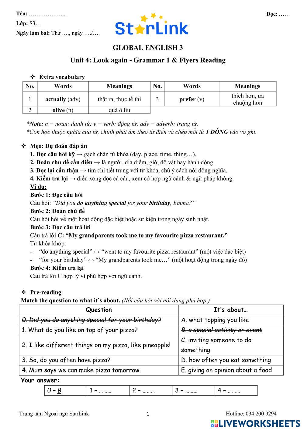 Created by starlink_s3 ESL English A1-Beginner Grammar English Author's Instructions StarLink My Google Classroom Courses × 0 classes selected (0 students total) Quick Access Select all classes (0 classes) All Classes Loading courses... Cancel Share Share to selected Course __COURSE_NAME__ __STUDENT_NAME__ (__STUDENT_EMAIL__) Online_Viet Teacher_S3_W11_U4_Grammar 1 & Flyers Reading Download Worksheet Validation Check my answers Emails my answers to my teacher Full name Group/level School subject Teacher's email or key code Close Submit Validating worksheet... (12) Your answers have been sent to your teacher. Good luck! OK We encountered an error submitting your answers. Please try again. OK Advertisement | Go Ad Free Created by starlink_s3 ESL English A1-Beginner Grammar English Author's Instructions StarLink Explore Worksheets CAN Ability ESL A1-Beginner CAN Ability Grammar - ESL Read, Write and Speak Use of English test ESL A1-Beginner Use of English test Grammar - ESL Unit 1 use of English - present simple, news and entertainment Sentences There is There are - a - an - some (any) with food ESL A1-Beginner Sentences There is There are - a - an - some (any) with food Grammar - ESL Food using There is - There are - with a- an- some (any) Irregular verbs ESL A1-Beginner Irregular verbs Grammar - ESL English as a second language Simple Past & Past Participle forms of Irregular Verbs Main content: Irregular verbs Other contents: Past simple, Present Perfect